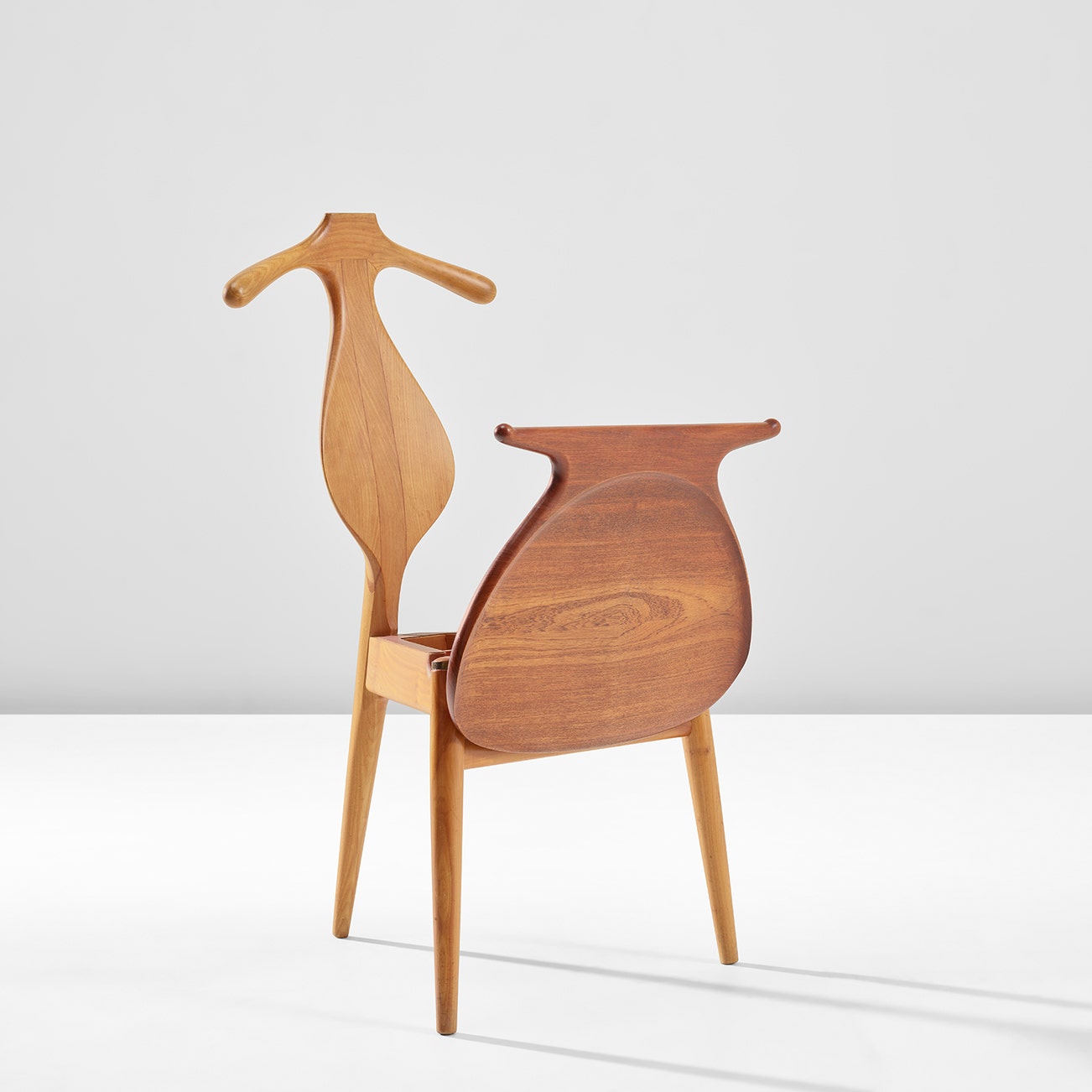 One of the most pleasing features of the chair is its elegant practicality. It was designed to be a multipurpose piece that can serve as both a chair and a valet stand. As early as 1951, Wegner had conceptualised this model after a discussion with Steen Eiler Rasmussen, a professor of architecture, and Kay Bojesen, a designer, about the challenges of folding clothes in the most functional manner before bedtime. However, it was not until the Danish King Frederik IX requested one after seeing the initial four-legged prototype that Wegner continued the design process. The integrated backrest-hanger is well suited to hang clothing and accessories, while the seat-storage unit with interior leather details is ideal for storing smaller items like wallets, watches, and jewellery. The chair's usefulness is further enhanced by its minimalist design, which allows it to blend seamlessly into any space. Wegner was a master of understatement, so the chair's clean lines and unadorned form make it a truly timeless piece.