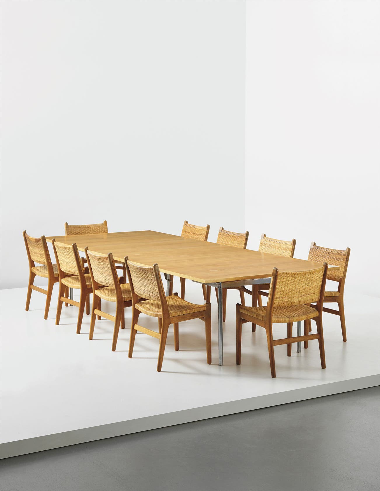 Manufactured by Carl Hansen & Søn, Denmark. Underside of 9 branded and impressed with manufacturer’s labels ‘DESIGNER/HANNES J. WEGNER’, ’MADE IN DENMARK/BY CARL HANSEN & SON/ODENSE DENMARK’ with paper label ‘DANISH/FURNITURE MAKERS CONTROL’ and one other with metal label ‘ILLUMS BOLIGHUS/KØBENHAVN’ (10).