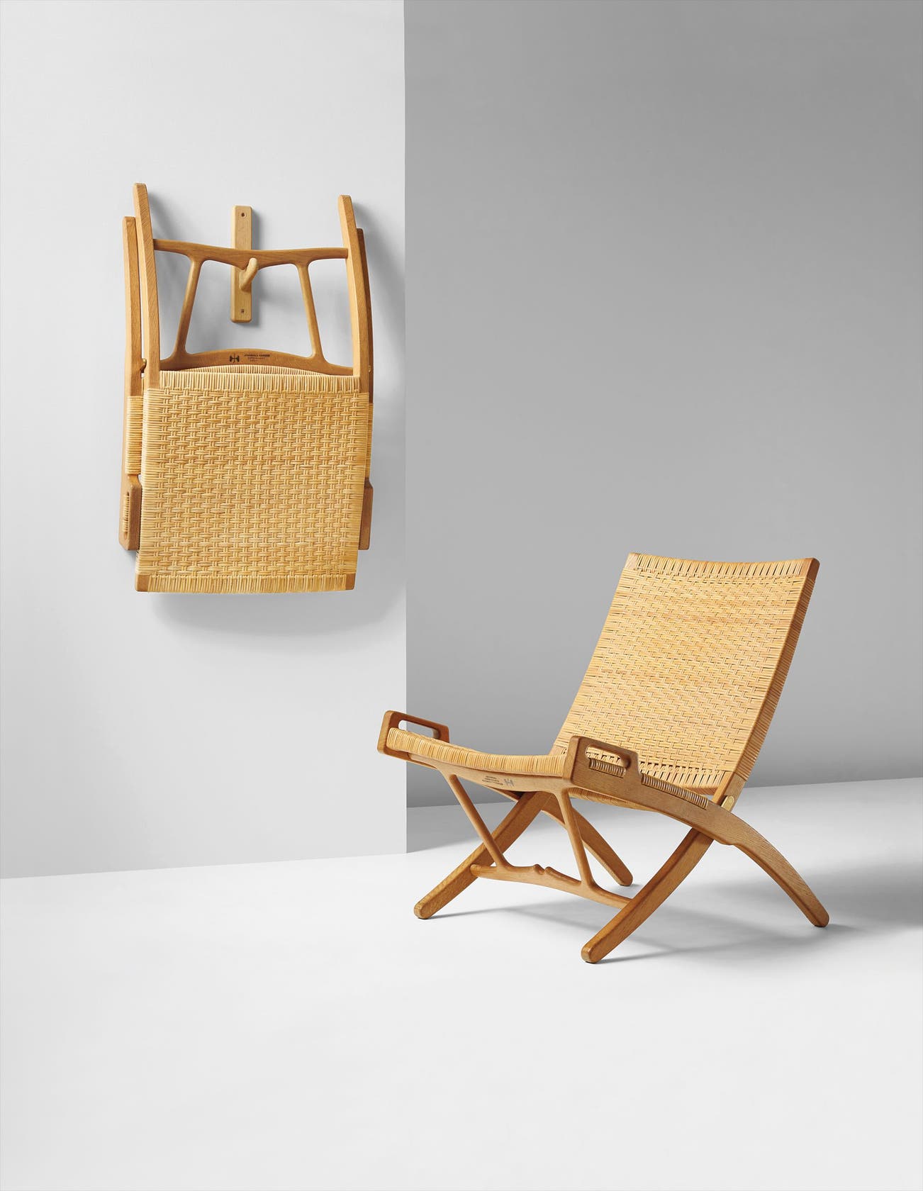 Each chair executed by cabinetmaker Johannes Hansen, Copenhagen, Denmark. Each underside impressed with maker's mark and JOHANNES HANSEN/COPENHAGEN/DENMARK. Later hanging bracket manufactured by PP Møbler, Allerød, Denmark.