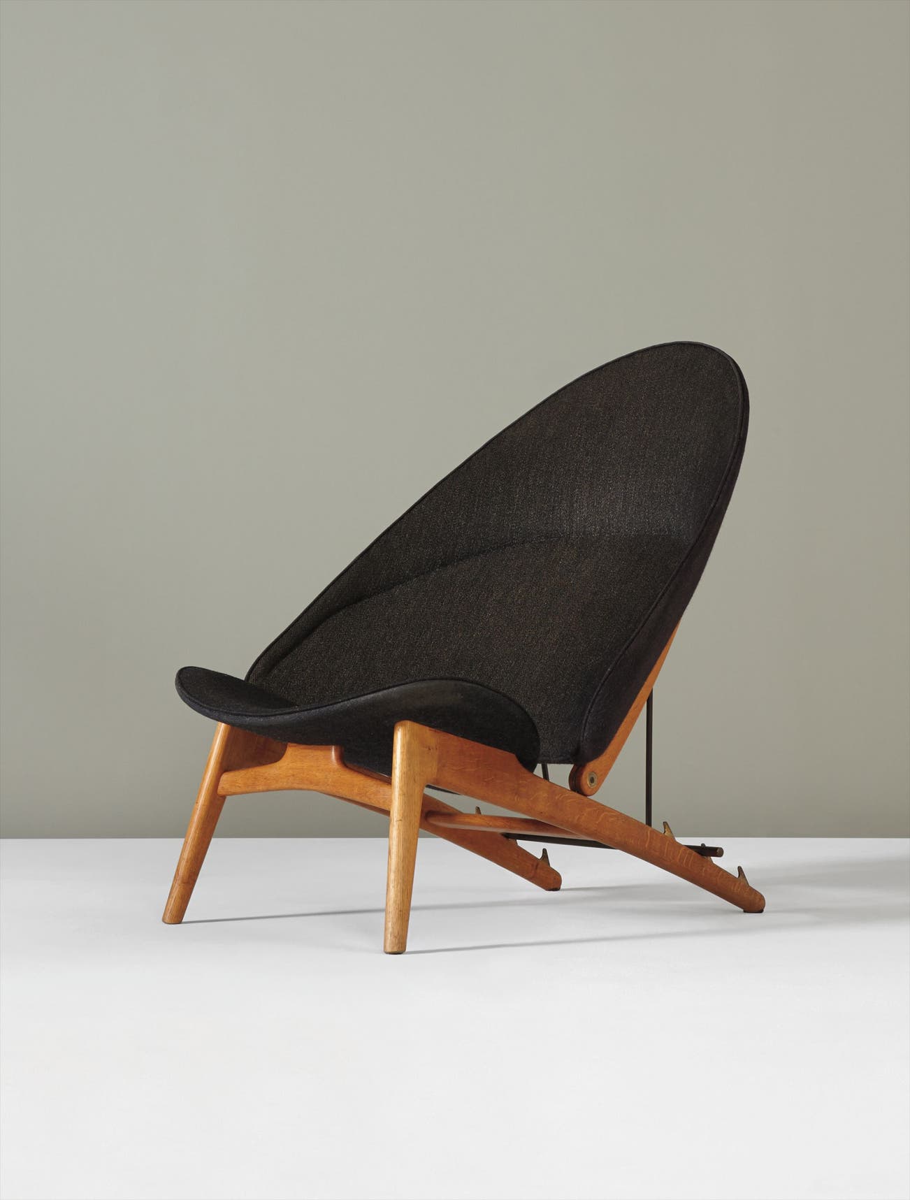 The present lot is one of two known period examples of the ‘Tub’ chair, a model which did not enter into wider production during Hans J. Wegner’s lifetime. The chair seat is composed of two pieces of fabric-covered moulded plywood. It rests on a dramatically angled oak base and is supported by a brass mechanism that allows for adjustment of the back angle. Its complexity prohibited fabrication in greater number, though it was included in the 1954 Cabinetmaker’s Guild exhibition in Copenhagen. The chair is a notable example of Wegner’s explorations into the possibilities of plywood, but ultimately the demands of employing both laminate and solid wood construction concurrently were too great and he chose to focus on the latter.