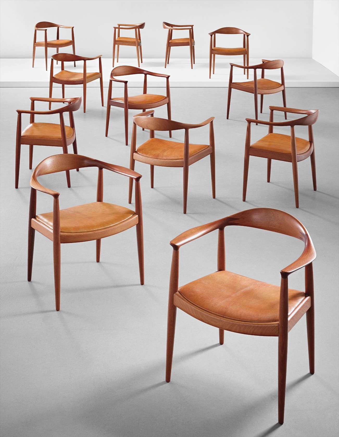 Executed by cabinetmaker Johannes Hansen, Copenhagen, Denmark. Underside of ten chairs branded with manufacturer's logo and label CABINETMAKER JOHANNES HANSEN/COPENHAGEN/DENMARK and five chairs also branded with 2.