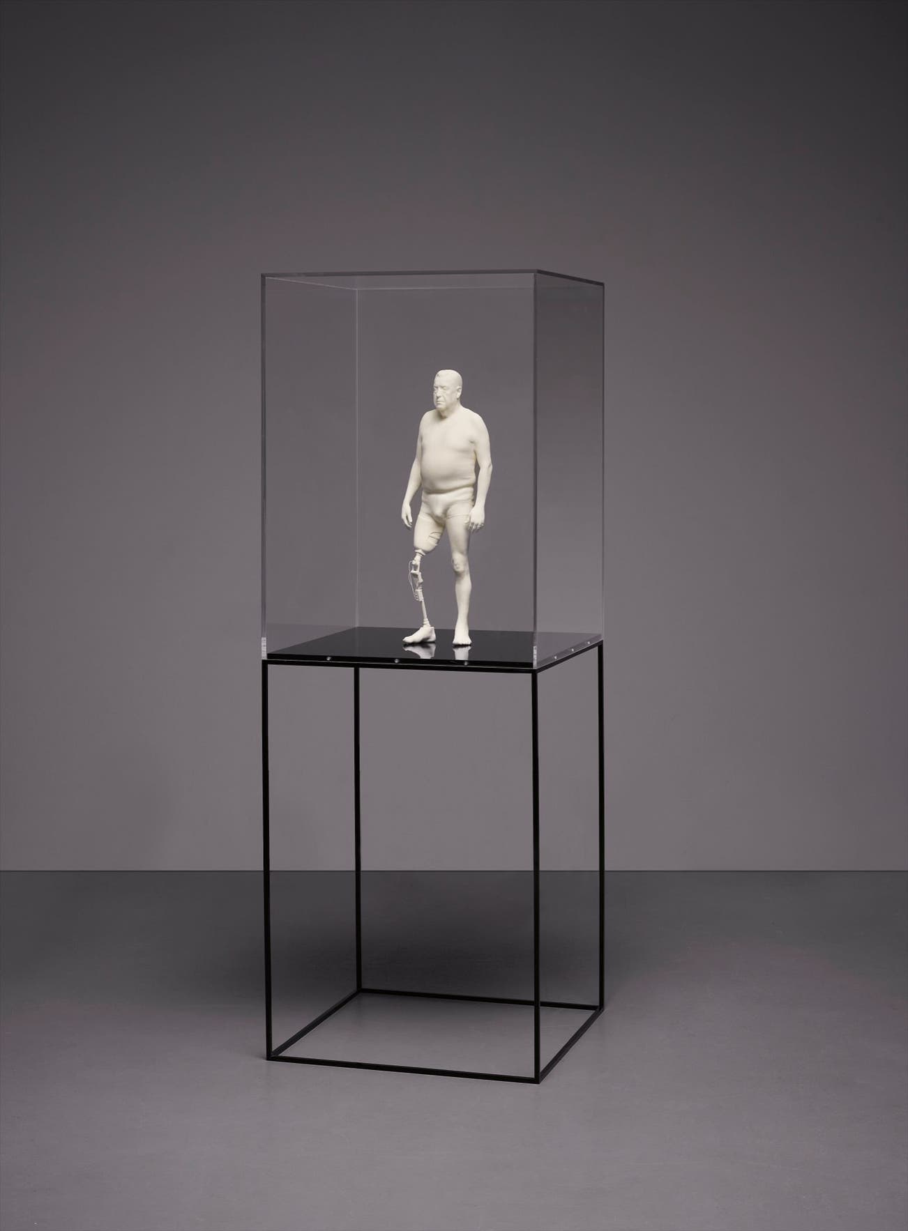 Laser-hardened 3-D resin print, metal plinth, Perspex case, plastic and wood.
