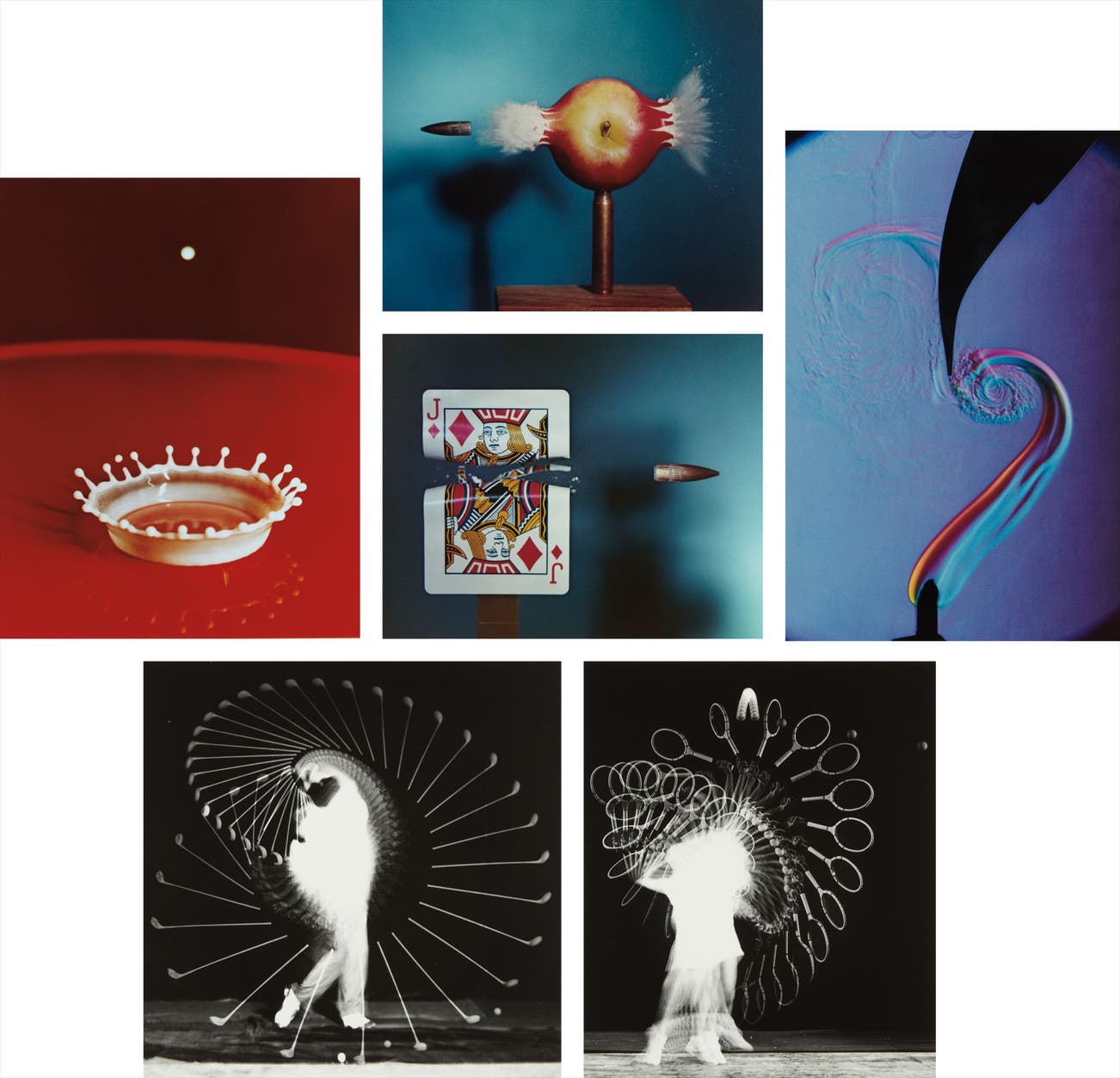 Titles include: Milk Drop Coronet, 1957; Bullet Through Apple, 1964; Fan and Flame Vortex (Schlieren Method), 1973; Bullet Through A Jack, 1964; Densmore Shut Bends the Shaft, 1938; Swirls and Eddies: Tennis, 1939; Gussie Moran Tennis Serve, 1952; Pole Vaulter David Tork, 1964; Bullet Through Plexiglas, 1962; "Home Brew”: Getting Off the Horse Quickly, 1940; A Girl and Her Horse, 1941; Football Kick – Wesley E. Fesler, 1934