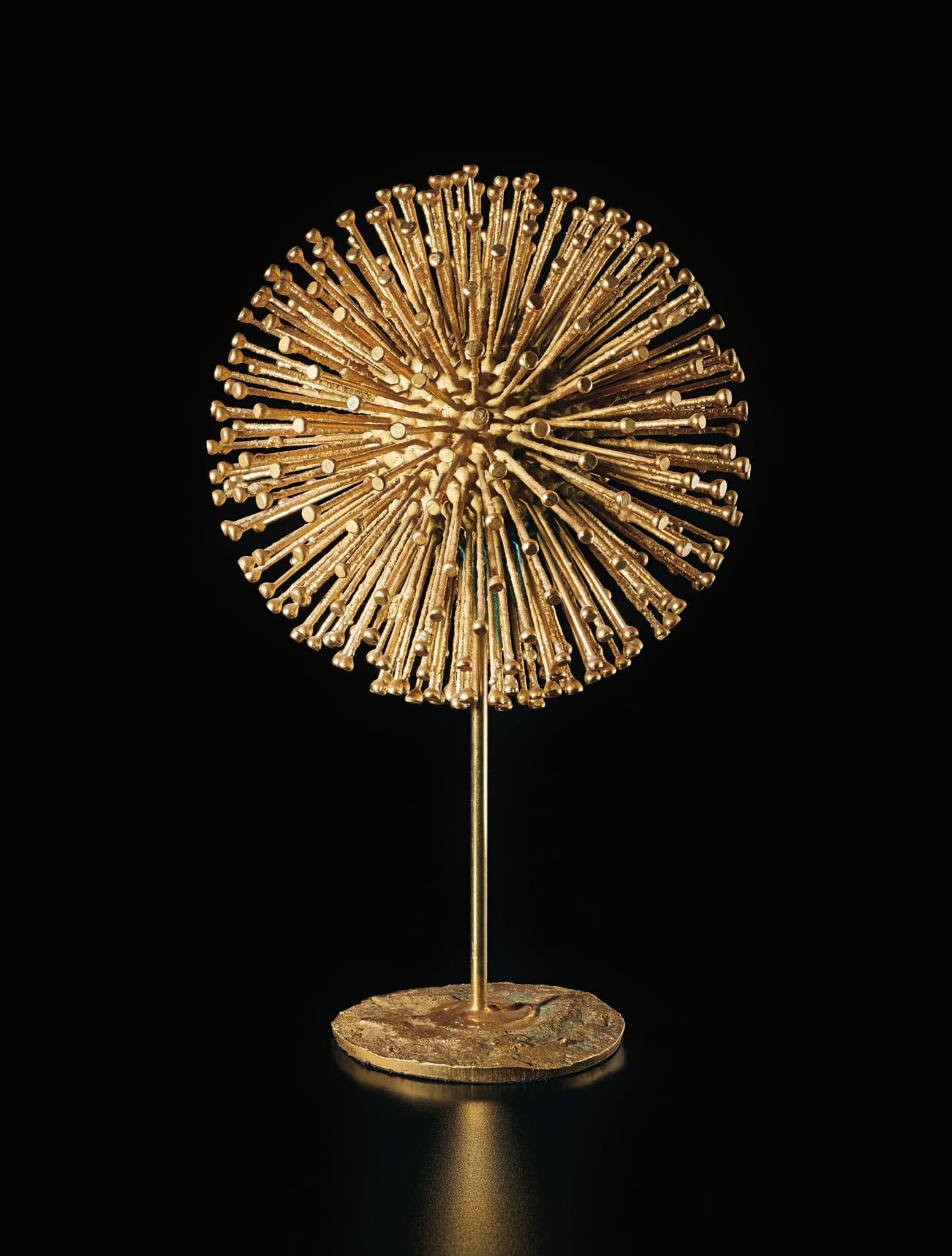 For a short period of time, between 1955 and 1962, Harry Bertoia experimented with a technique using welded cut nails to create sculptural plant-like forms. Partly inspired by a trip to his birthplace in Italy during this period in which he sought to manifest the energy and radiance of a sunburst, the present lot embodies an aesthetic preoccupation that enjoyed significant longevity in Bertoia’s work. This sunburst shape is considered the precursor for Bertoia’s "Bush" and "Dandelion" forms and the present lot is an example of this important transitional period in his technique and style.