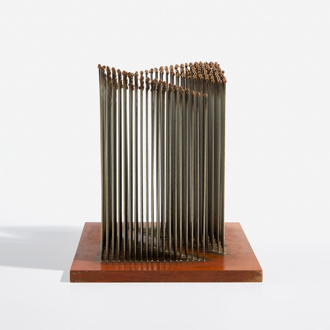 This is the first Sonambient that Bertoia gifted to Moss. Constructed of hundreds of rods ranging from five to eight inches high, each surmounted with a unique droplet of metal, it may be the only Sonambient to feature such a wide range of pitches.