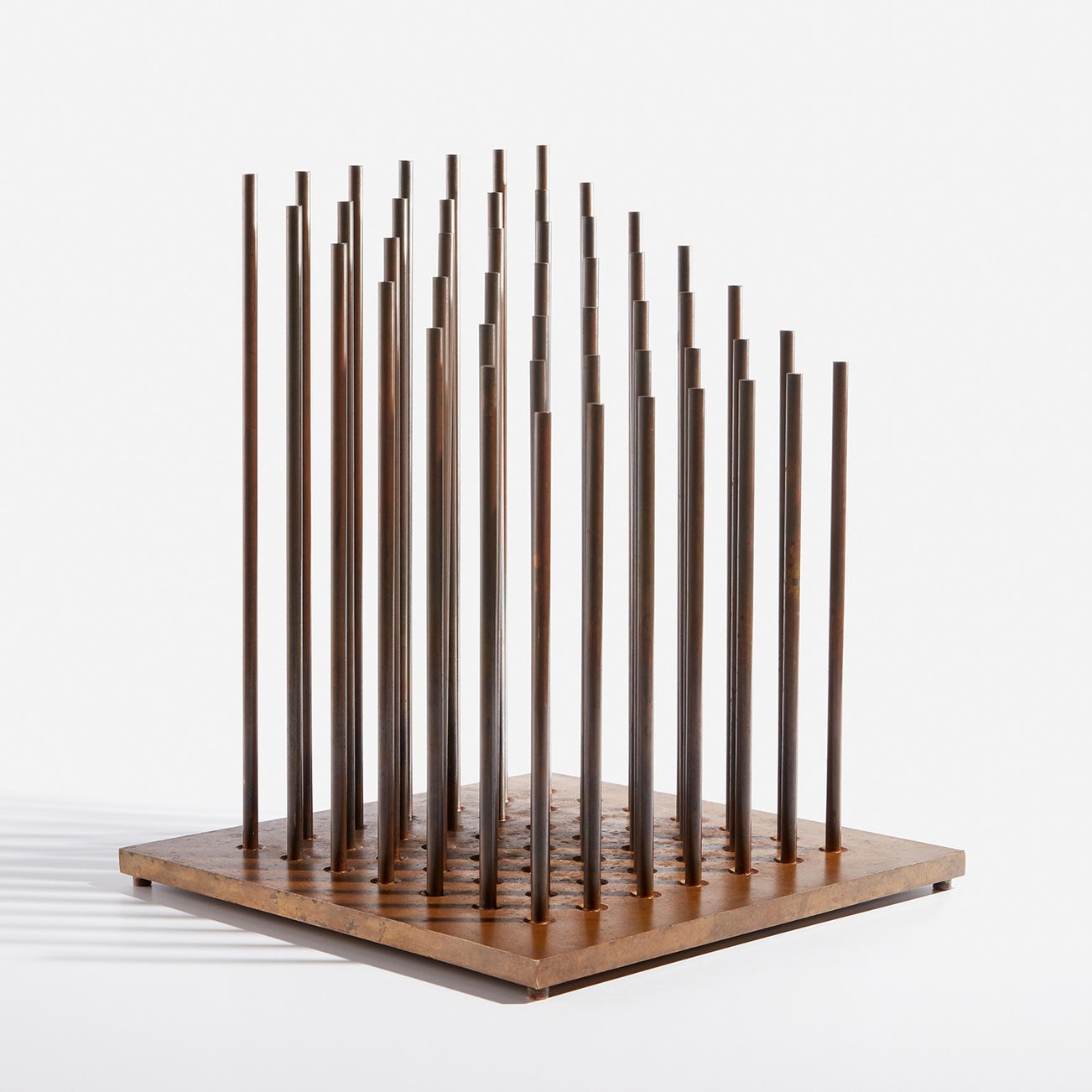 Harry Bertoia gifted the present Sonambient sculpture on one of David Moss’s last visits to the studio in the late 1970s. Featuring rows of thicker rods in ascending heights, it has a more unusual “spooky” tone with micro-tonal pitches creating a dissonant effect.