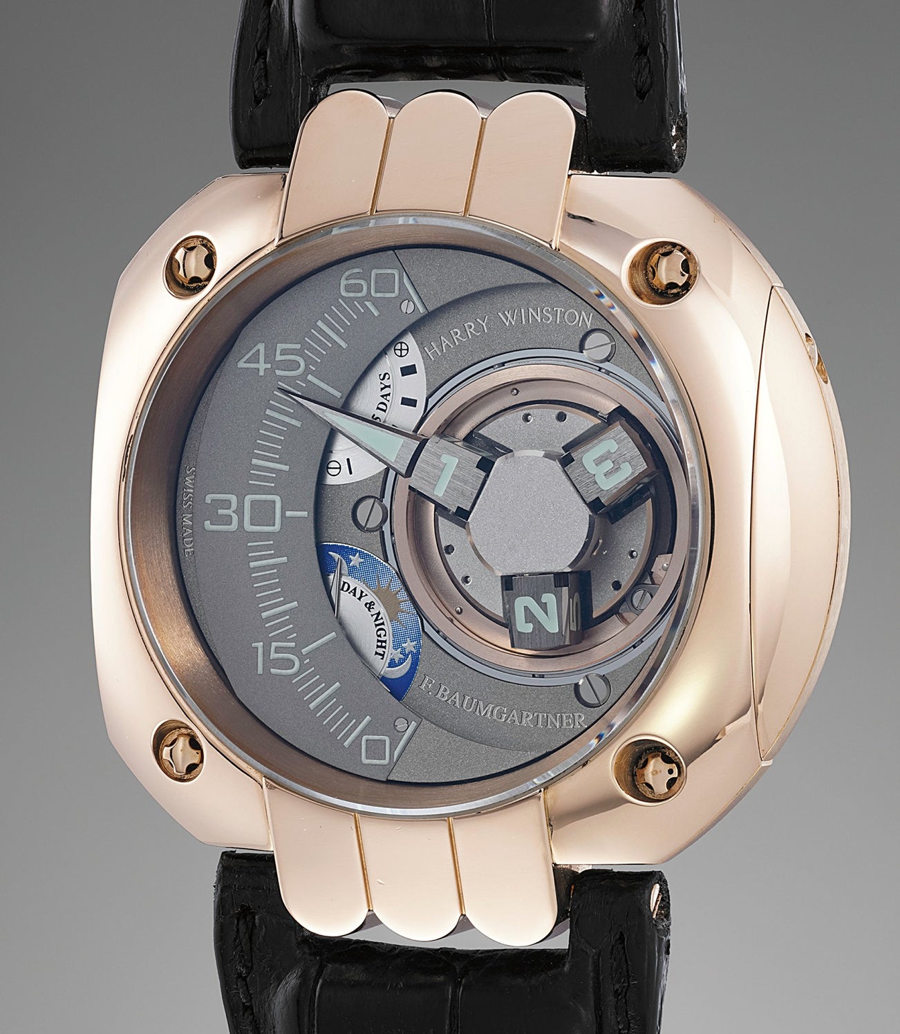 An impressive and rare limited edition pink gold wristwatch with three dimensional satellite hour display, retrograde minutes, five-day power reserve, day and night indication and five-year service indicator