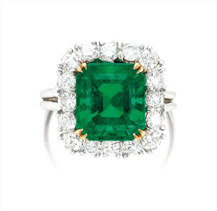 One step-cut emerald, 4.17 caratsCircular-cut diamonds in the surround, totalling approximately 1.10 caratsPlatinum and 18 karat yellow gold<em>With a Harry Winston Insurance Appraisal letter dated 25 April 1995 and a signed ring box </em>(4.17-carat Emerald)