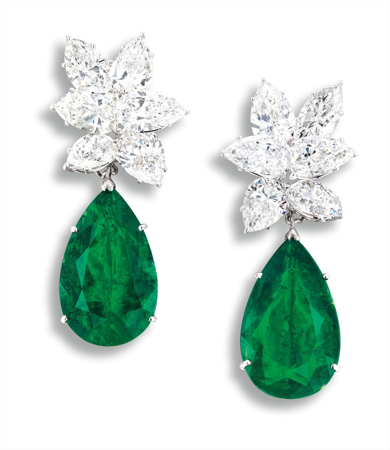 Two pear-shaped emeralds, 14.59 and 12.54 caratsCluster tops set with twelve pear-shaped diamonds, totalling 23.84 caratsPlatinum<em>With a signed box and a Harry Winston authenticity letter </em>(14.59 and 12.54-carat Emeralds)