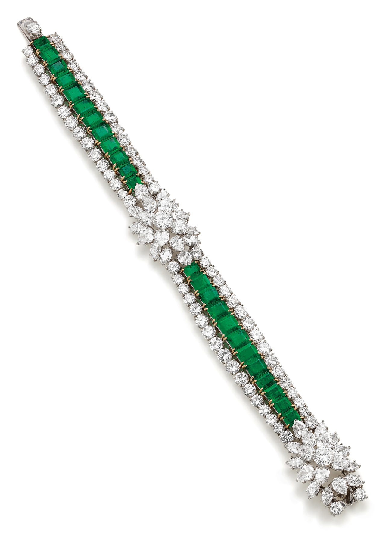 An Important Diamond, Emerald, Platinum and Gold Bracelet