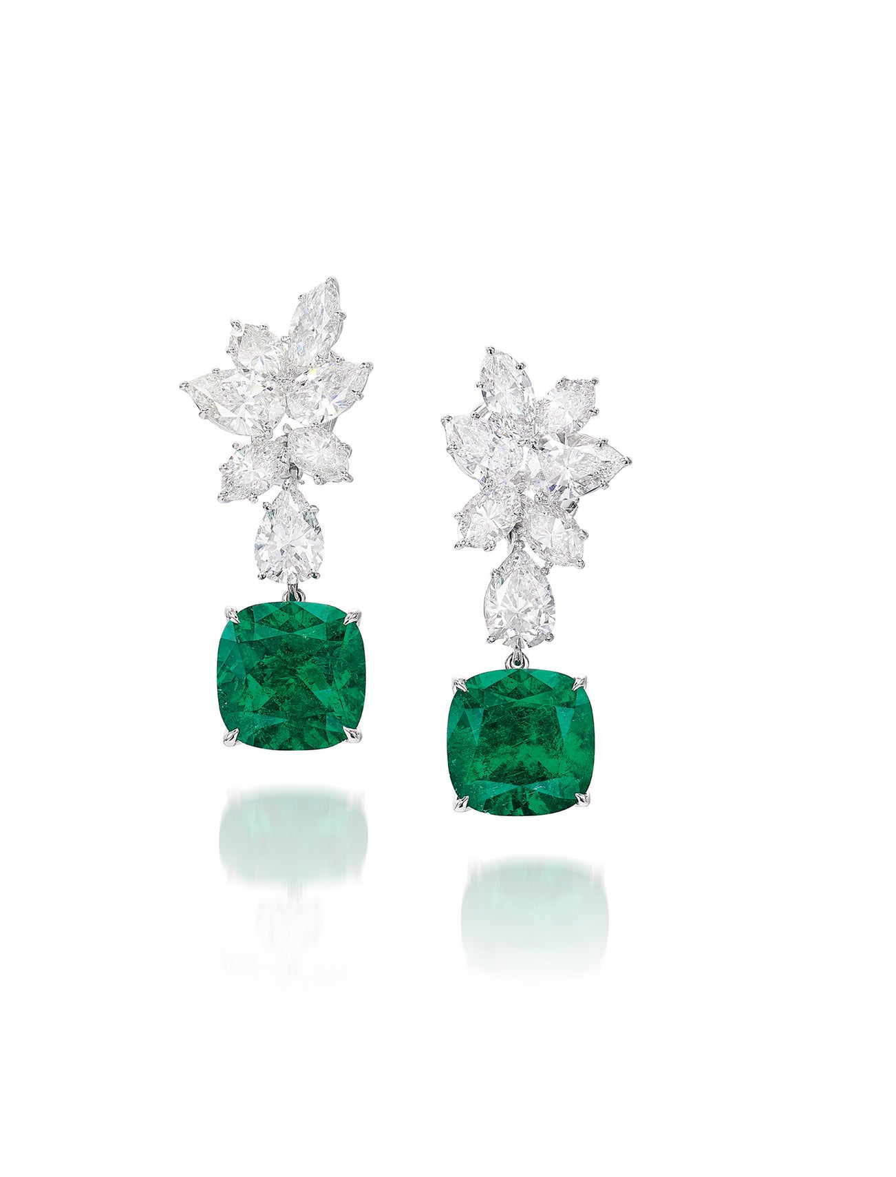 An Important Pair of Emerald and Diamond Earrings, the Surmount, by Harry Winston