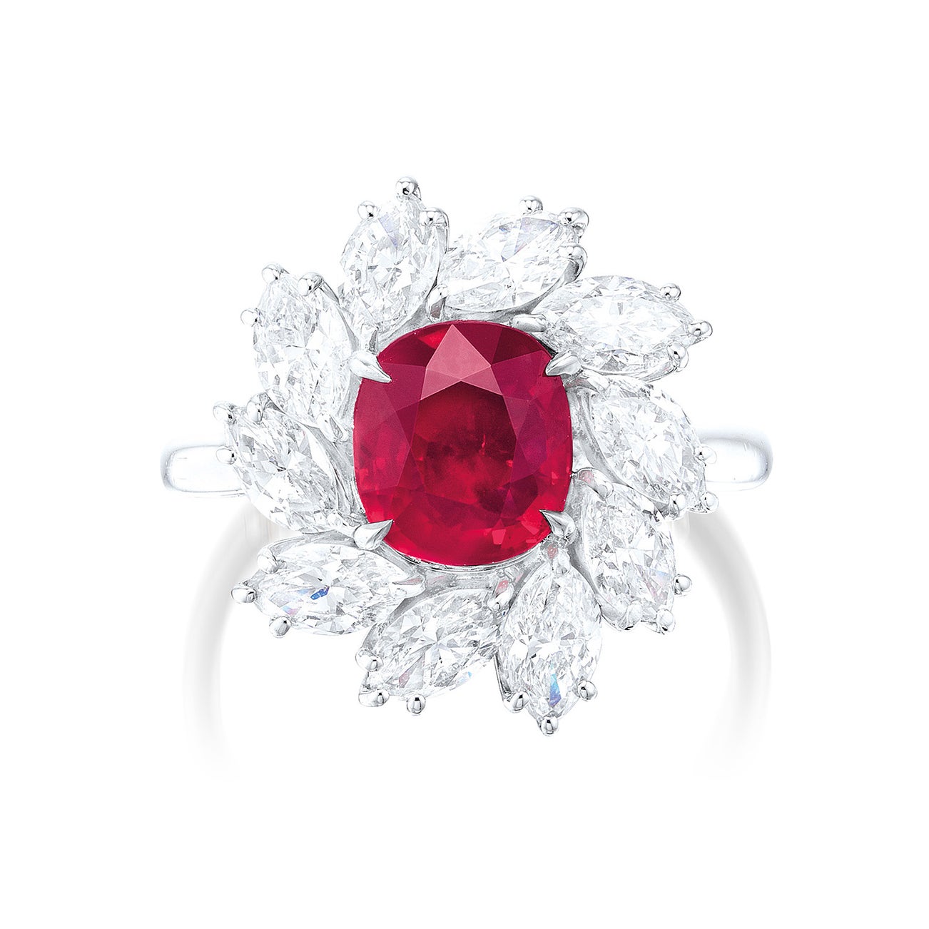 One cushion-shaped ruby, 2.35 caratsTen marquise-cut diamond surroundPlatinumMaker's mark, Jacques Timey for Harry Winston<em>SSEF Report: Burma, no indications of heating</em>
