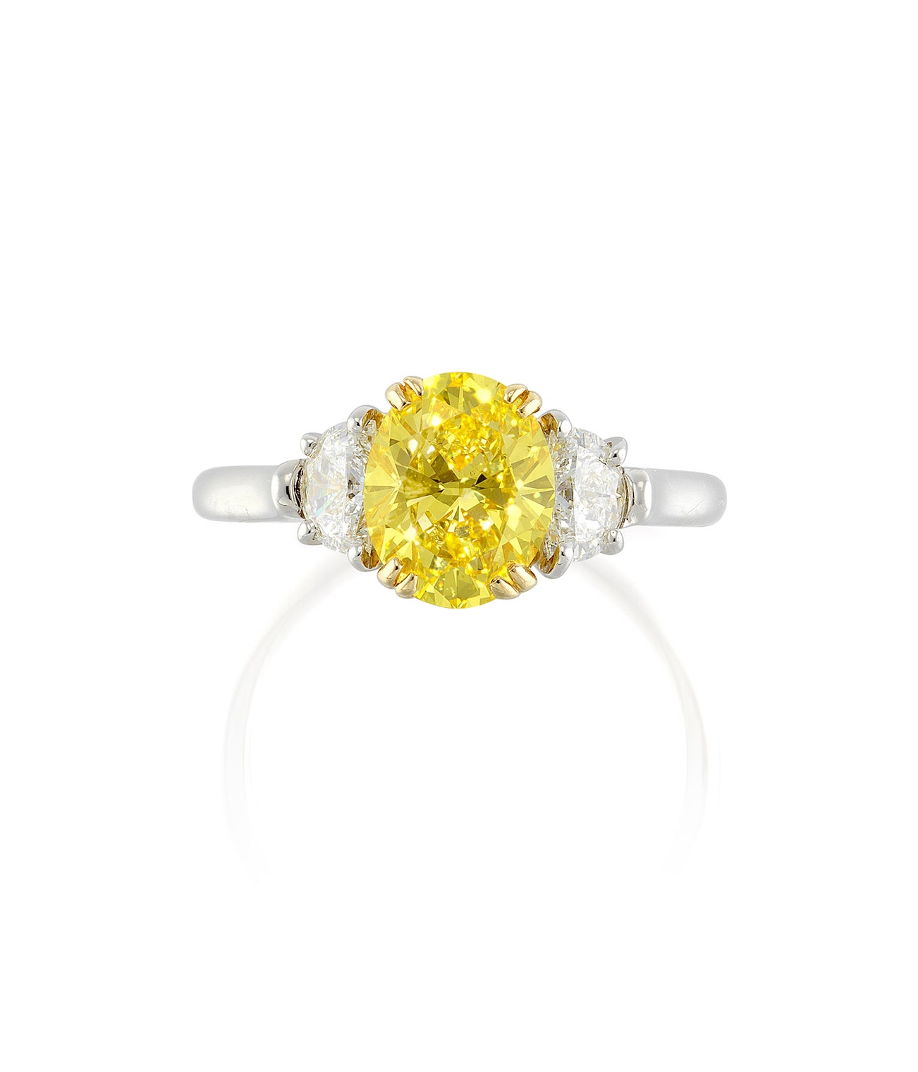 Set with an oval fancy intense yellow diamond weighing approximately 1.76 carats, flanked by two half-moon diamonds, mounted in platinum and gold, size 6½.