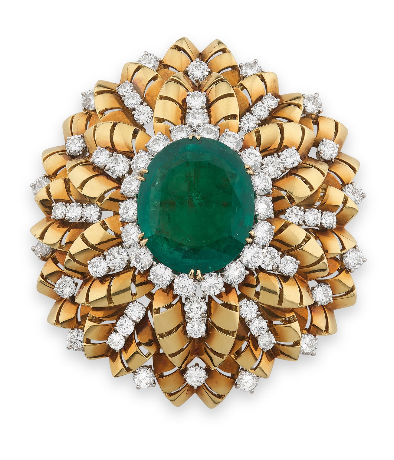 Set with an oval emerald weighing 24.73 carats, highlighted with brilliant-cut diamonds, measuring approximately 65 x 60mm, unsigned, maker's mark for Jacques Timey, case and box stamped Harry Winston.