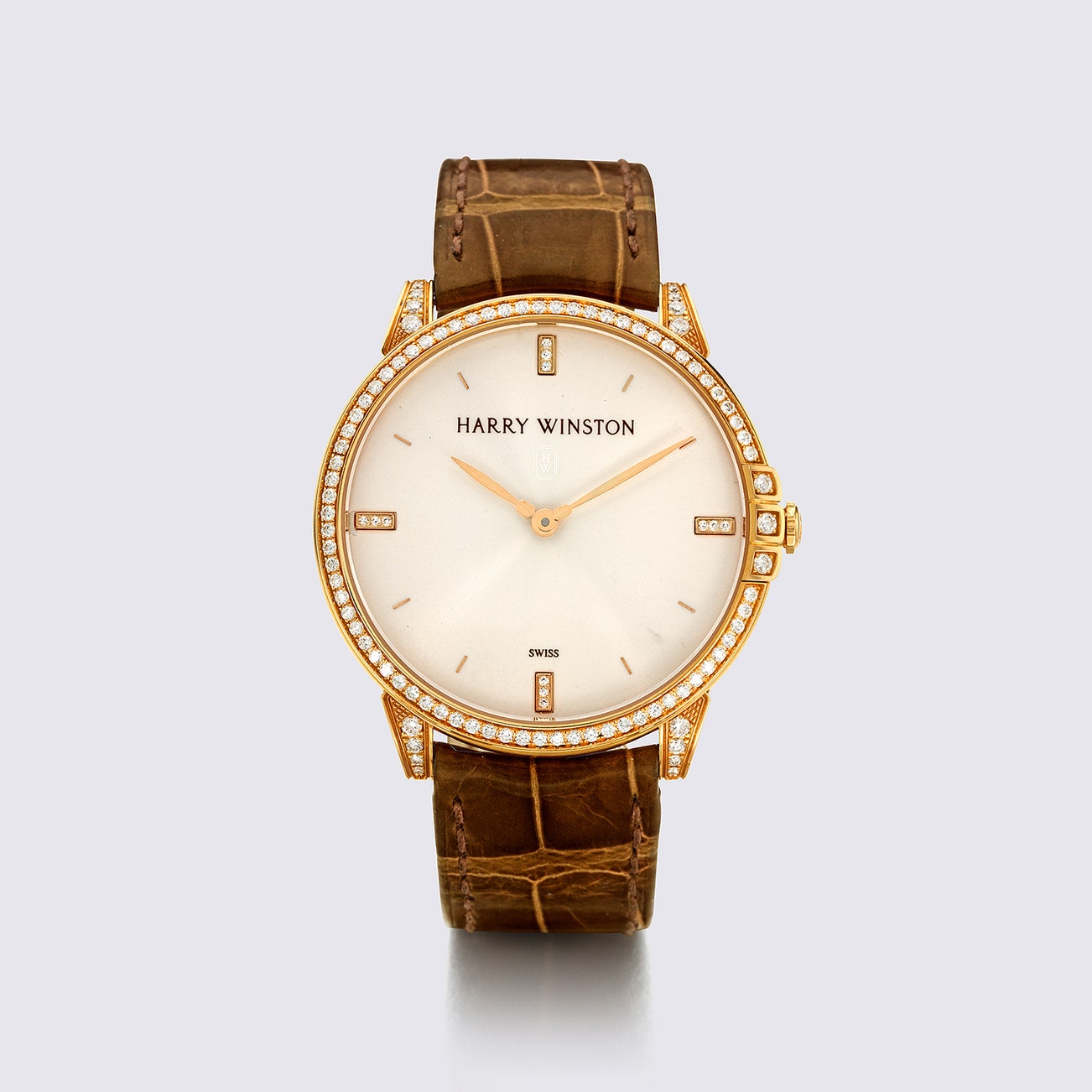 The champagne rose tone dial within a brilliant-cut diamond-set bezel and rose gold case, completed by a brown alligator leather strap and a signed rose gold pin buckle, mounted in 18K rose gold, quartz movement, case diameter is 39mm, total length approximately 9 inches, signed Harry Winston, Midnight, No.374, numbered, with Swiss hallmark and maker's mark, accompanied by a signed original box and a brand catalog.