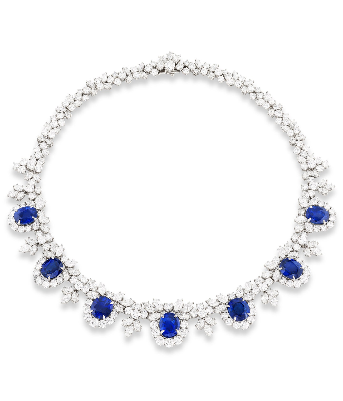 Set with oval and cushion-shaped sapphires weighing 4.28, 4.98, 4.35, 5.30, 4.85, 4.11 and 4.76 carats respectively, highlighted with marquise-shaped and brilliant-cut diamonds, length approximately 390mm, signed Harry Winston, numbered, maker's mark for Jacques Timey.