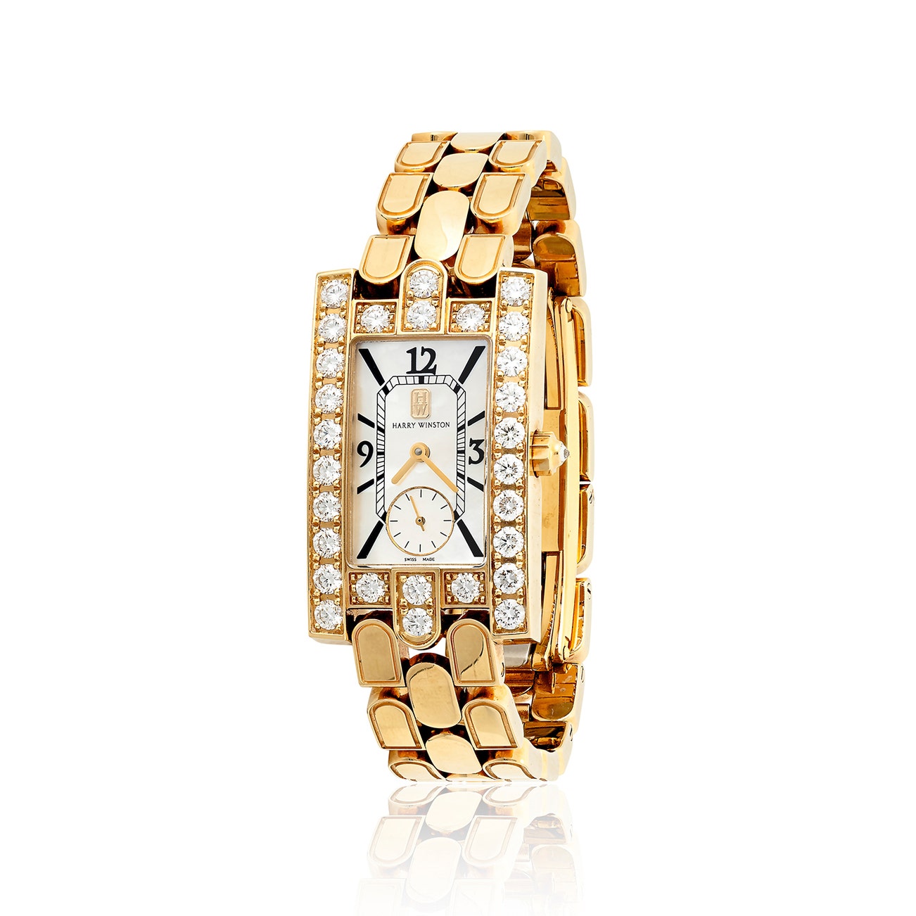 Of quartz movement, mother-of-pearl dial, baton hands, Arabic numerals at 12, 3 and 9 o'clock, brilliant-cut diamond-set bezel, gold bracelet, diameter approximately 21mm, inner circumference approximately 155mm, dial and caseback signed Harry Winston, caseback numbered, dial and caseback with maker's mark for Harry Winston, Swiss hallmark for gold.