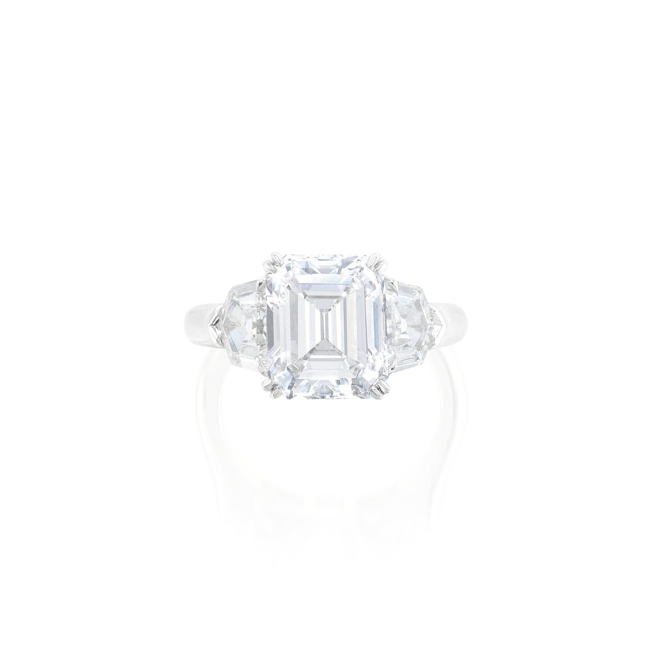 Set with an emerald-cut diamond weighing 5.10 carats, between two shield-shaped diamonds, mounted in platinum, signed Winston, maker's mark for Jacques Timey, size 7¼, case stamped Harry Winston.