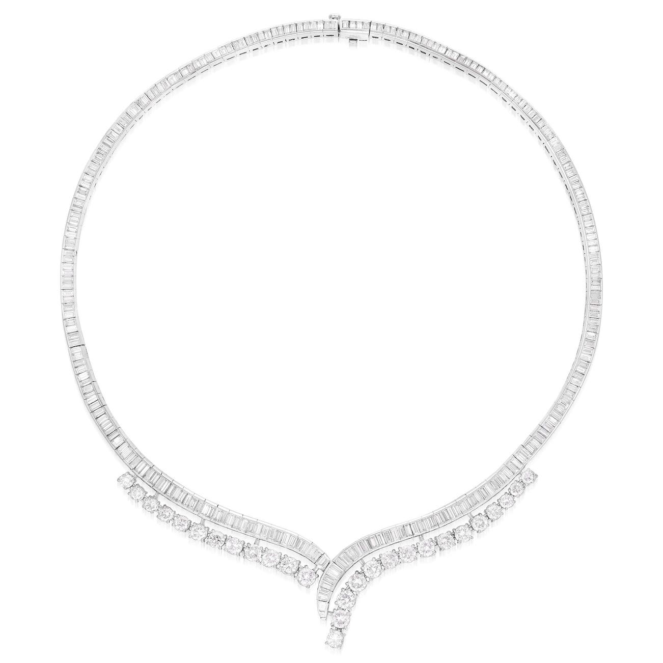 The necklace channel-set with baguette and tapered baguette diamonds, to the front decorated with brilliant-cut diamonds, mounted in platinum, signed Winston for Harry Winston, maker's mark for Jacques Timey, length approximately 395 mm, case stamped Harry Winston.