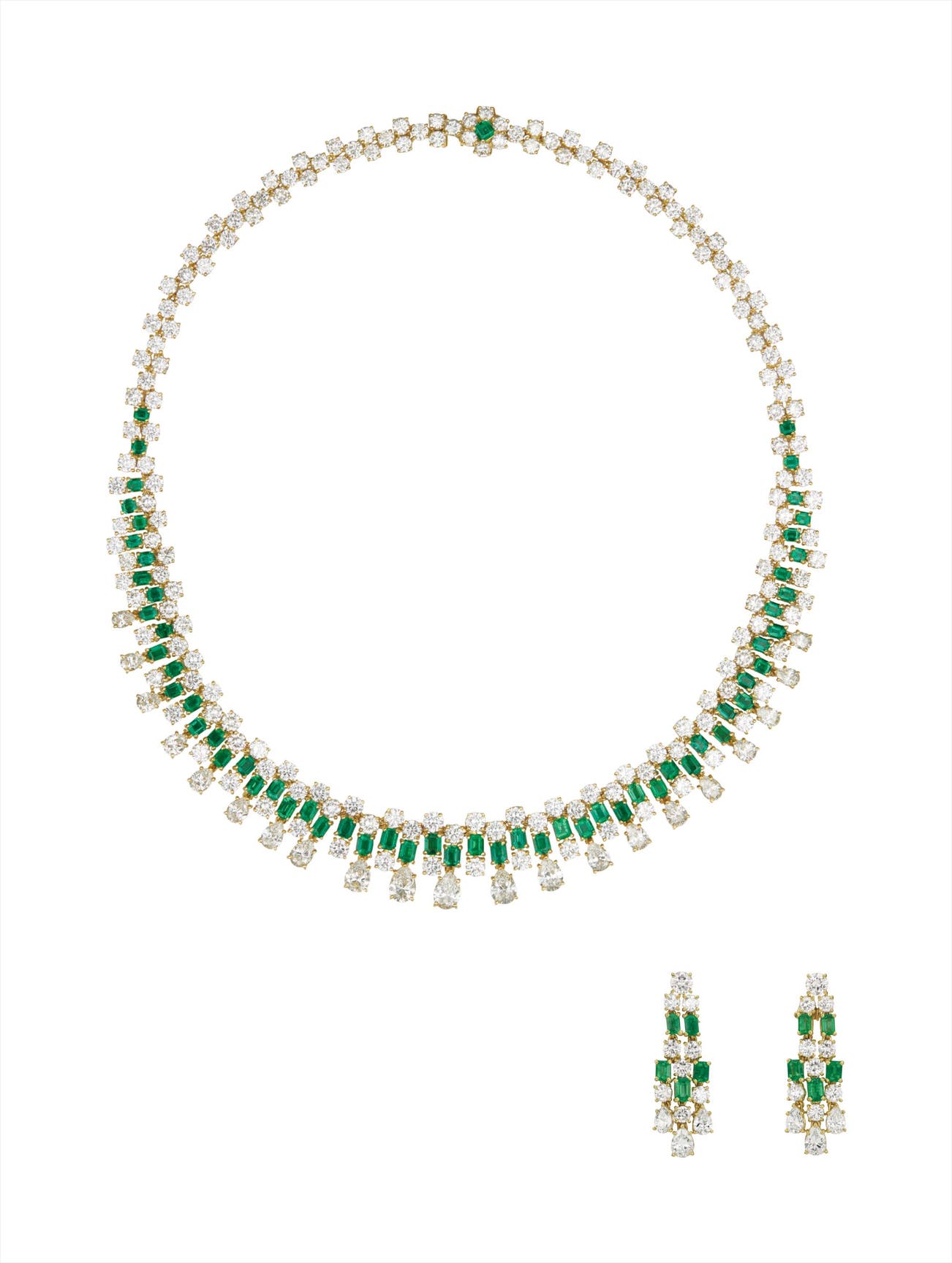 Comprising a necklace designed as a line of circular and pear-shape diamonds, the front centrally enhanced by circular and rectangular-cut emeralds; a pair of ear pendants en suite; mounted in 18K yellow gold, necklace length 16 inches, ear pendant length 1 1/2 inches.