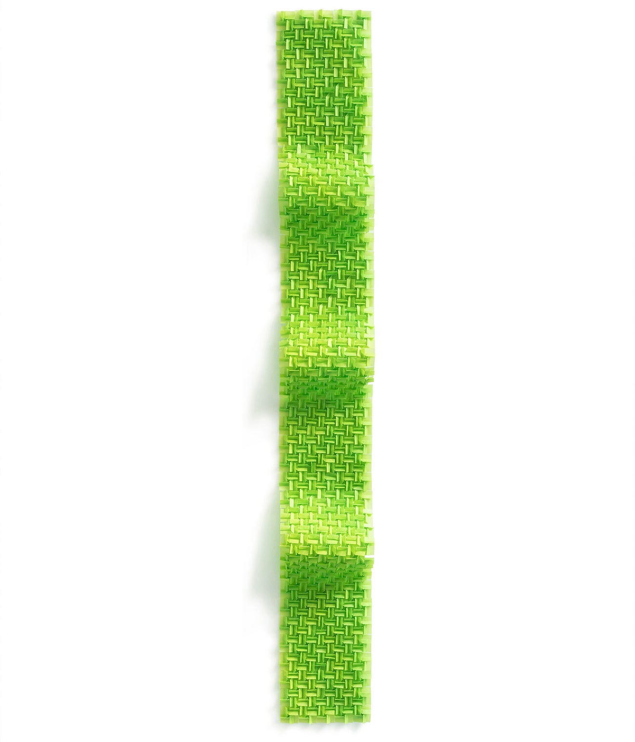 Hazel Lim (b. 1975, Singapore) employs text, crafting methods and drawing in her works to investigate the utility of diagrams, image making and colour theory. Past Spring, A Rolling Pasture features chromatic paper, hand-folded to form a square-pocketed pattern. Each piece of origami is slotted with and adhered to another to create a draped fabric-like tapestry, while the tinted frames that house the green tapestry create nuanced gradients and tonal accents with shadows and light.