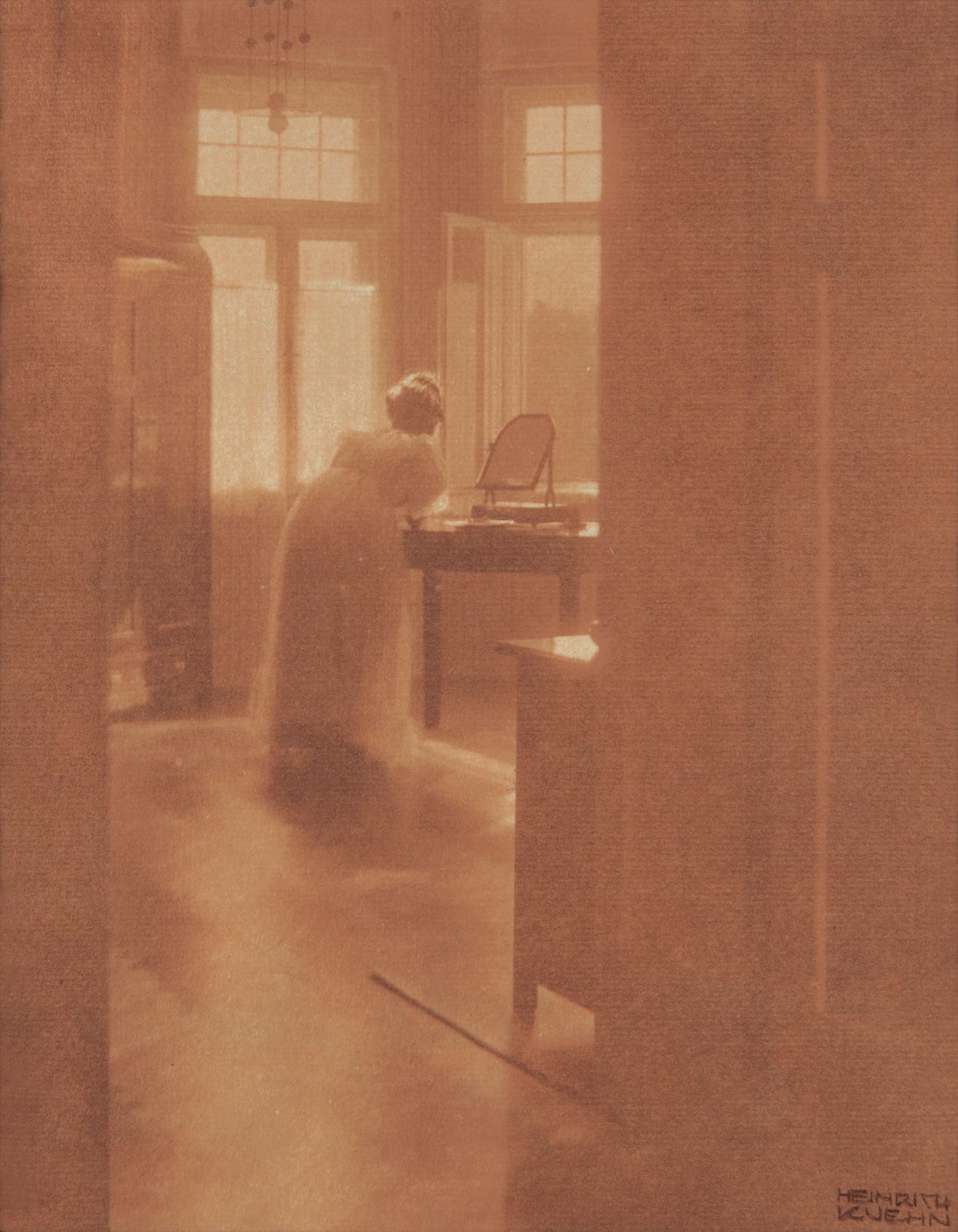 The image was taken at the turn of the last century and is infused with an unmistakable pictorial atmosphere. Indeed, photography was a relatively nascent field, and in an effort to gain the respect of art critics had set out to mimic the tenets of painting. It is of no surprise therefore, that Kuehn’s majestic image is deeply Impressionistic. Like the compellingly beautiful interior scenes by the painters Mary Cassat and Berthe Morisot, Kuehn presented a soft and loving depiction of a woman in her natural space, with her social guard down.