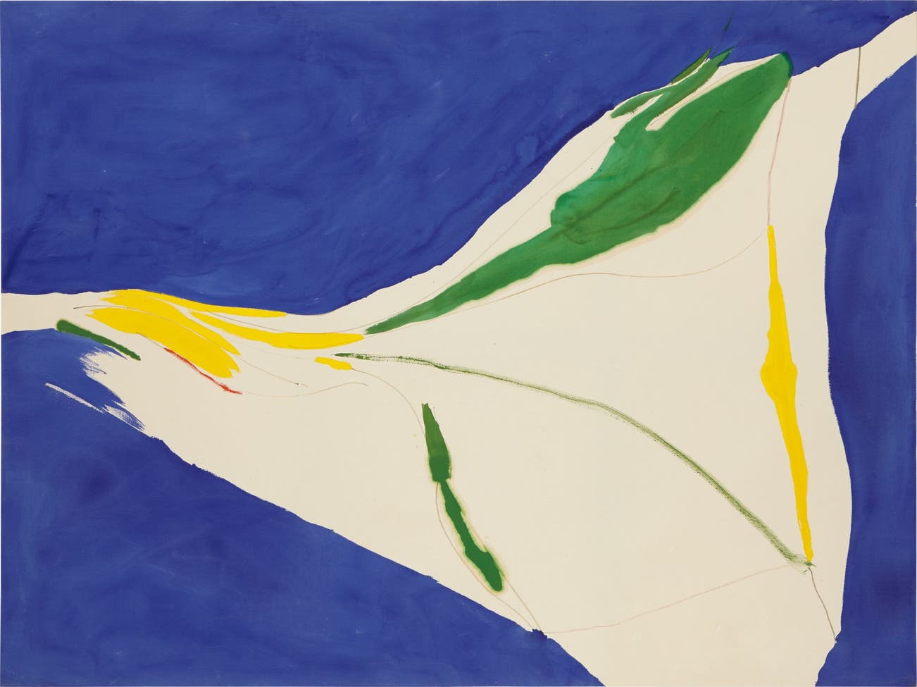 The natural landscape was a continuous point of departure for Frankenthaler and her imagery was often informed by her impressions of nature; however, her paintings were never a direct abstraction of it. She was not interested in a romantic search for the sublime and did not adhere to a single artistic method. Each work was approached as an individual exploration and, unlike many of her contemporaries, she never produced work in serial terms. While her groundbreaking technique would go on to influence future artistic developments, Frankenthaler’s practice remained profoundly committed to itself. “What concerns me when I work, is not whether the picture is a landscape, or whether it is pastoral, or whether somebody will see a sunset in it. What concerns me is – did I make a beautiful picture.” (Helen Frankenthaler, as quoted in The New York Times, 1989.)
