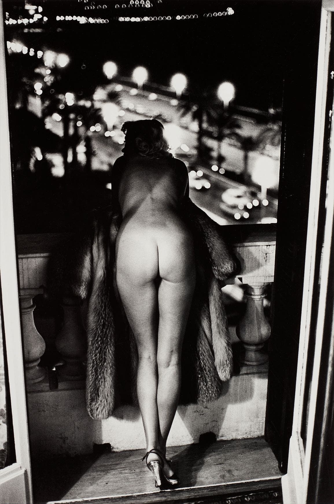 The following eight lots are highlights from Suite I and III. Two Pairs of Legs in Black Stockings (lot 13), taken from a floor-level, tilted angle, implies the hidden control exercised by its female protagonists. In Hotel Room, Place de la République (lot 14), the model tied to the bed highlights Newton’s fascination with fetishism and sadomasochism. Winnie at the Negresco (lot 15) contrasts the model’s bare body against the lush fur coat. Roselyne in Arcangues (lot 19), taken during the four days that Newton and the model spent in a chateau in France, demonstrates Newton’s presentation of women as simultaneously empowered and fetishised. These works showcase Newton’s use of photography to evoke erotic fantasies of desire and domination.