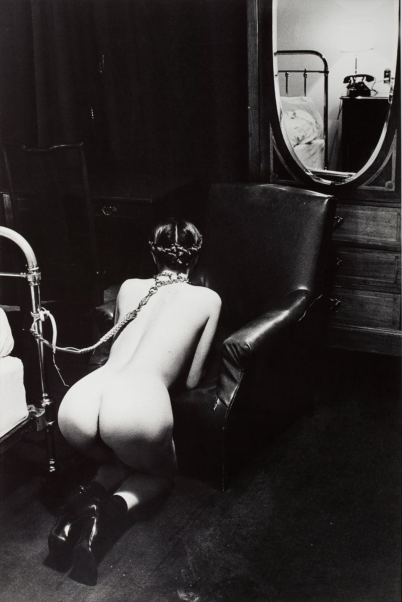 The following eight lots are highlights from Suite I and III. Two Pairs of Legs in Black Stockings (lot 13), taken from a floor-level, tilted angle, implies the hidden control exercised by its female protagonists. In Hotel Room, Place de la République (lot 14), the model tied to the bed highlights Newton’s fascination with fetishism and sadomasochism. Winnie at the Negresco (lot 15) contrasts the model’s bare body against the lush fur coat. Roselyne in Arcangues (lot 19), taken during the four days that Newton and the model spent in a chateau in France, demonstrates Newton’s presentation of women as simultaneously empowered and fetishised. These works showcase Newton’s use of photography to evoke erotic fantasies of desire and domination.