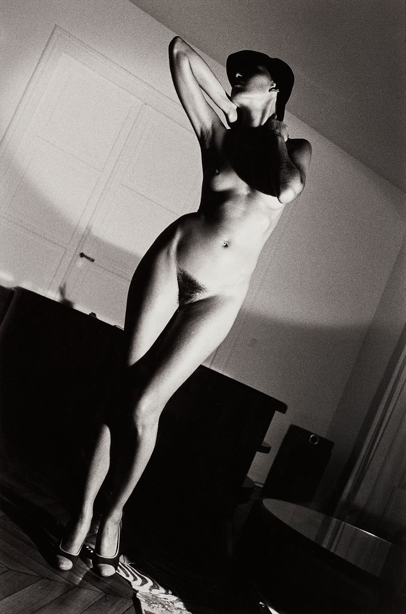The following eight lots are highlights from Suite I and III. Two Pairs of Legs in Black Stockings (lot 13), taken from a floor-level, tilted angle, implies the hidden control exercised by its female protagonists. In Hotel Room, Place de la République (lot 14), the model tied to the bed highlights Newton’s fascination with fetishism and sadomasochism. Winnie at the Negresco (lot 15) contrasts the model’s bare body against the lush fur coat. Roselyne in Arcangues (lot 19), taken during the four days that Newton and the model spent in a chateau in France, demonstrates Newton’s presentation of women as simultaneously empowered and fetishised. These works showcase Newton’s use of photography to evoke erotic fantasies of desire and domination.