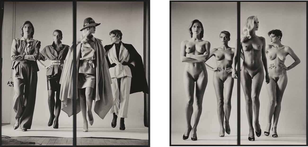 First used as a two-page spread in French Vogue in 1981, Sie Kommen, Paris marked a turning point in Newton’s work. Newton started working for French Vogue in the 1960s and had become famous for introducing erotic subjects to fashion photography. In his earlier work, the location in which he photographed his models added to the sexual fantasy of his images, but with Sie Kommen, Paris, Newton left the lush interiors and streets of Paris and shot his subjects in a studio. In Sie Kommen (Dressed) we see the interior of the studio where the white backdrop touches the floor. In contrast, in Sie Kommen (Naked) the clothes disappear with the exception of high heels, and the studio becomes a boundless white space. As Karl Lagerfeld once noted, it is only with high heels that “. . . a woman [is] really naked for Newton.” With no supporting props the dressed and naked models become the whole story. Anne Tucker, who curated the first American retrospective of Newton, said “Big Nudes, for me, is where he steps away from the fashion magazines and came into his own on what a Helmet Newton woman was. . . Look at the way these women are boldly striding in these pictures. . . They are Amazons.”