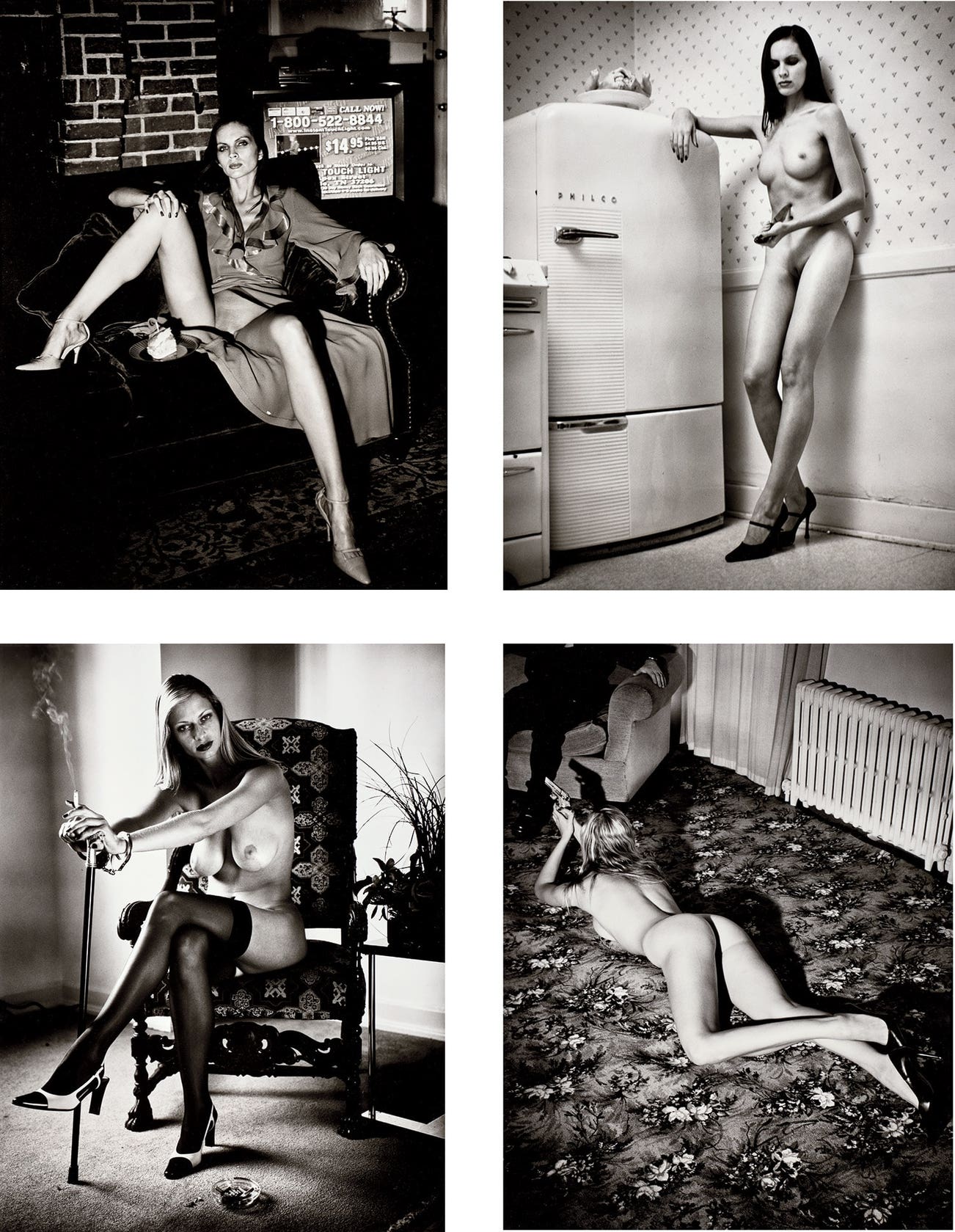 Newton created a working space for his models that was part decadent and part unorthodox — a safe microcosm in which fantasies became reality. And perhaps most famously of all, Newton engendered an environment in which his female models claimed the space around them with unapologetic poise and commanding sensuality. His almost cinematic compositions provided a hyper-real backdrop for the provocative images of sculptural, larger-than-life women, and enhanced the themes of voyeurism and fetishism that run throughout his work.