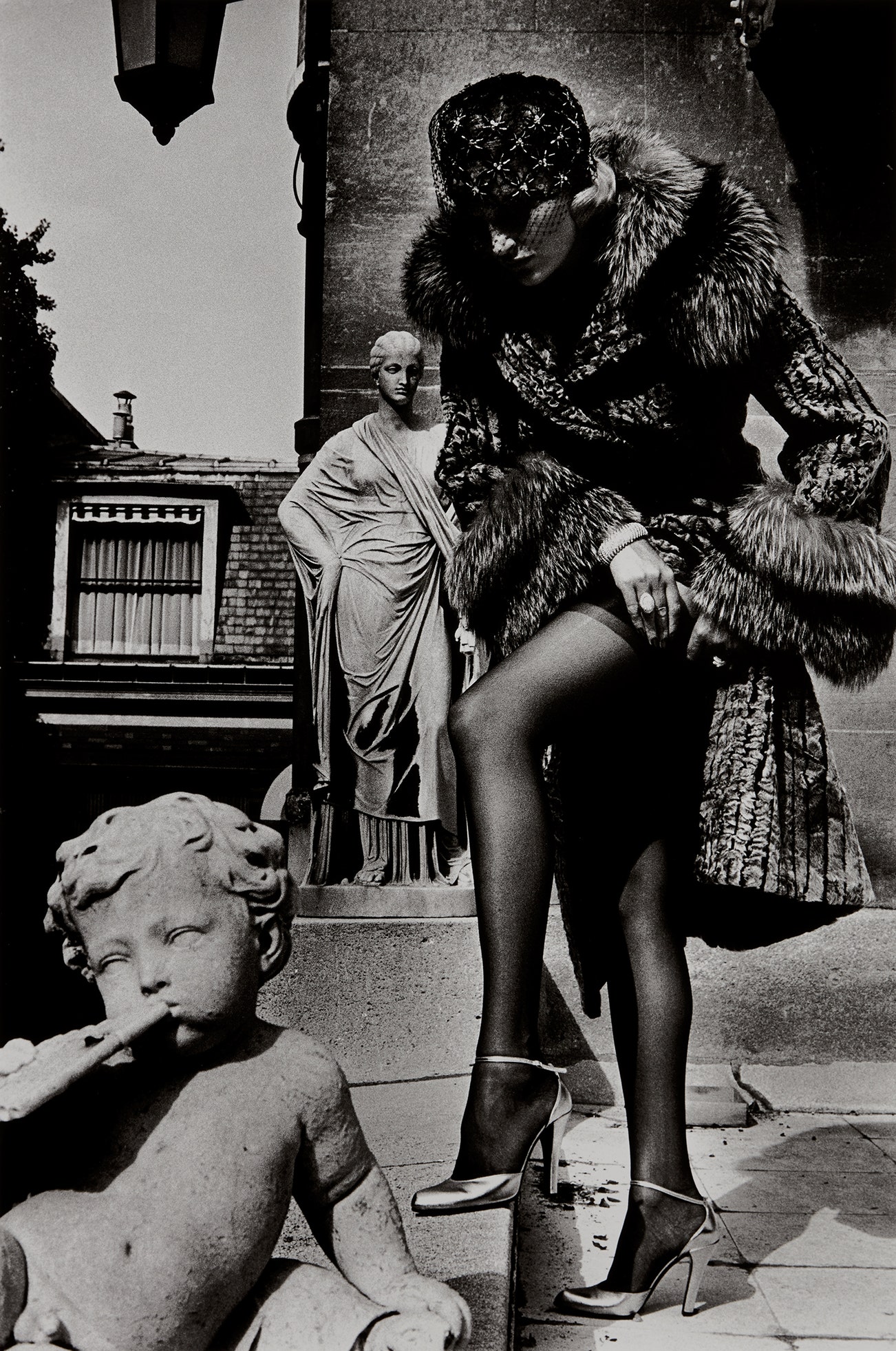 Woman in Fur Coat Adjusting Stocking, Paris