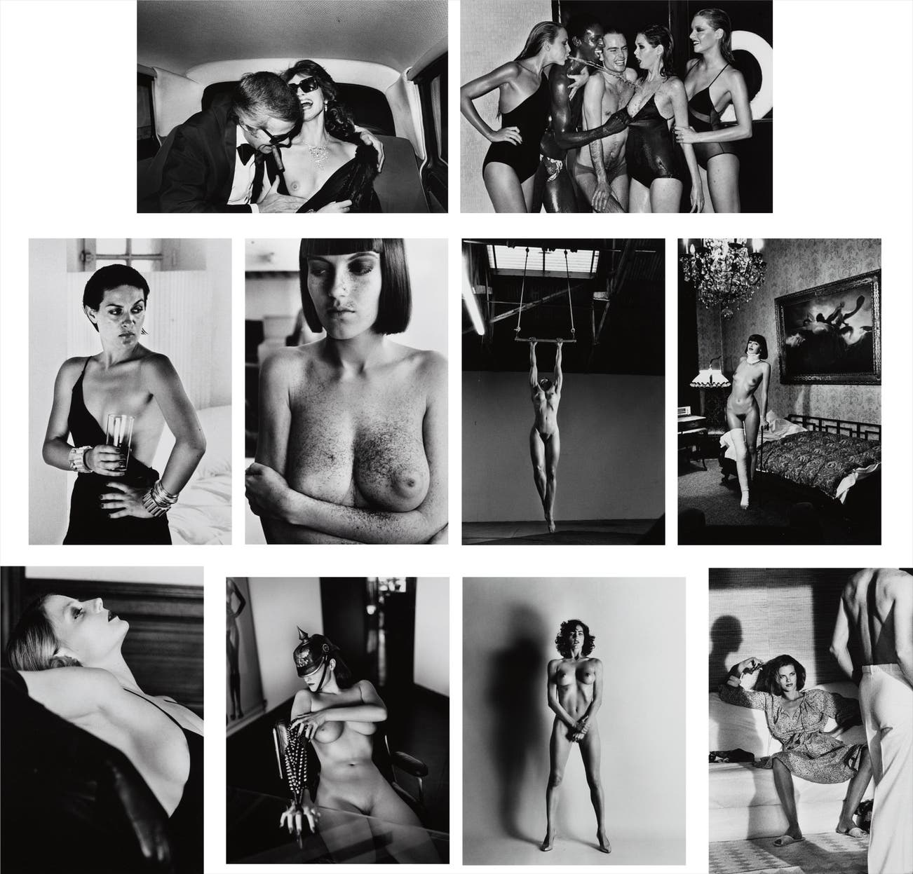 Arielle after a Haircut, Paris, 1982; Woman Examining Man, U.S. Vogue, Saint Tropez, 1975; By-product of an Advertising Sitting, Paris, 1975; Jodie Foster, Hollywood, 1987; Paloma Picasso, Saint Tropez, 1973; Lisa Lyon at Home, Venice, California, 1981; Jerry Hall, Spitting, French Vogue, Paris, 1978; Eva with Pickelhaube, Monte Carlo, 1993; Jenny Kapitän, Pension Dorian, Berlin, 1977 andBig Nude III, Henrietta, Paris, 1980