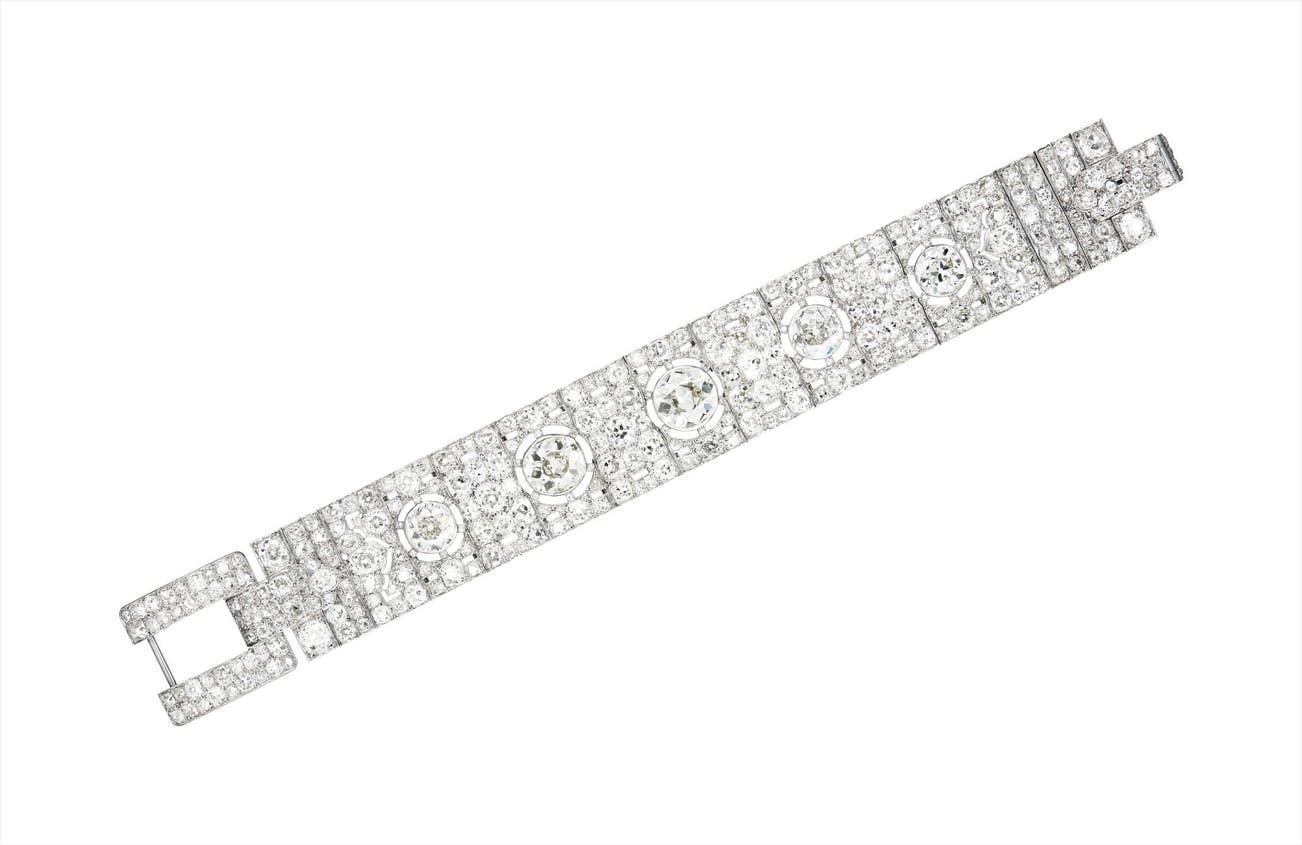 Designed as a series of open-work, geometric plaques entirely set with old-cut diamonds, centering upon a line of larger old-cut diamonds, mounted in platinum, length 7 1/2 inches.
