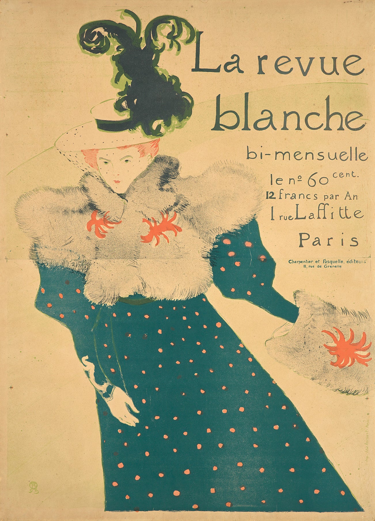 Toulouse-Lautrec shows Misia Natanson, wife of the magazine's editor, Thadée Natanson, ice-skating at the Palais de Glace, an ice rink opened at the Rond-Point des Champs-Élysées by Jules Roques in 1894. This poster, along with Pierre Bonnard's initial version, ushered in the age of commissioning cutting-edge fine artists to create eye-catching and novel advertisements.