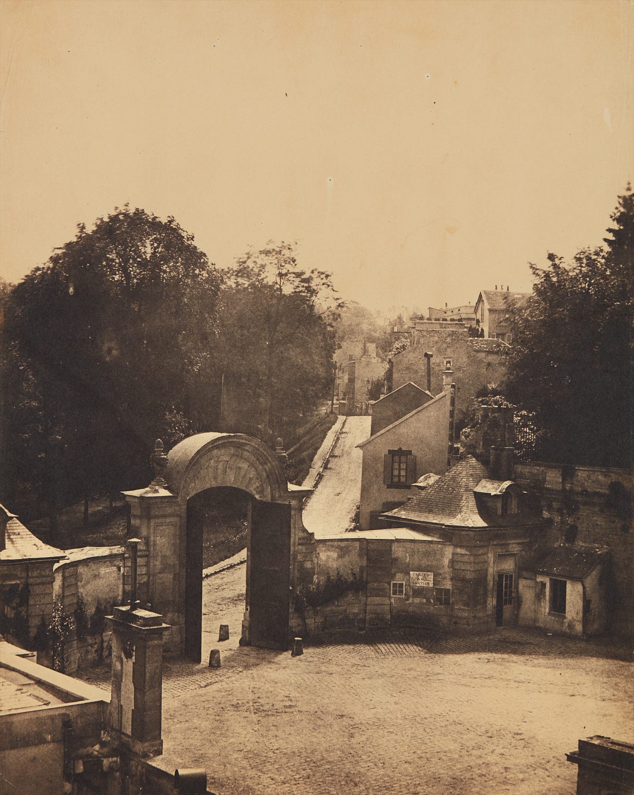 Victor Regnault was among the first practitioners of photography in France, and although examples of his work are scarce, his surviving photographs are notable for their technical and aesthetic sophistication. In addition to serving as the director of the porcelain manufactory at Sèvres, Regnault was a man of science, and his experiments and publications on physics and chemistry established his reputation in those fields. He began working with photography as early as 1841, when a colleague sent him an example of paper sensitized by William Henry Fox Talbot. Regnault’s work with the new medium progressed from there, and he quickly developed his own improvements to the paper-negative process. While he made skillful portraits and genre studies, it is arguably his masterful views of Sèvres that are the most accomplished images in his oeuvre. André Jammes and Eugenia Parry Janis write that “Regnault’s most luminous landscapes depict the town of Sèvres, the river and the buildings of the manufactory, in an uncanny self-generating light with soft apricot coloration in the highlights” (The Art of French Calotype, p. 238). Surprisingly large in format, Regnault’s Sèvres views embody a clarity and three-dimensionality not usually seen in photographs made from paper negatives.