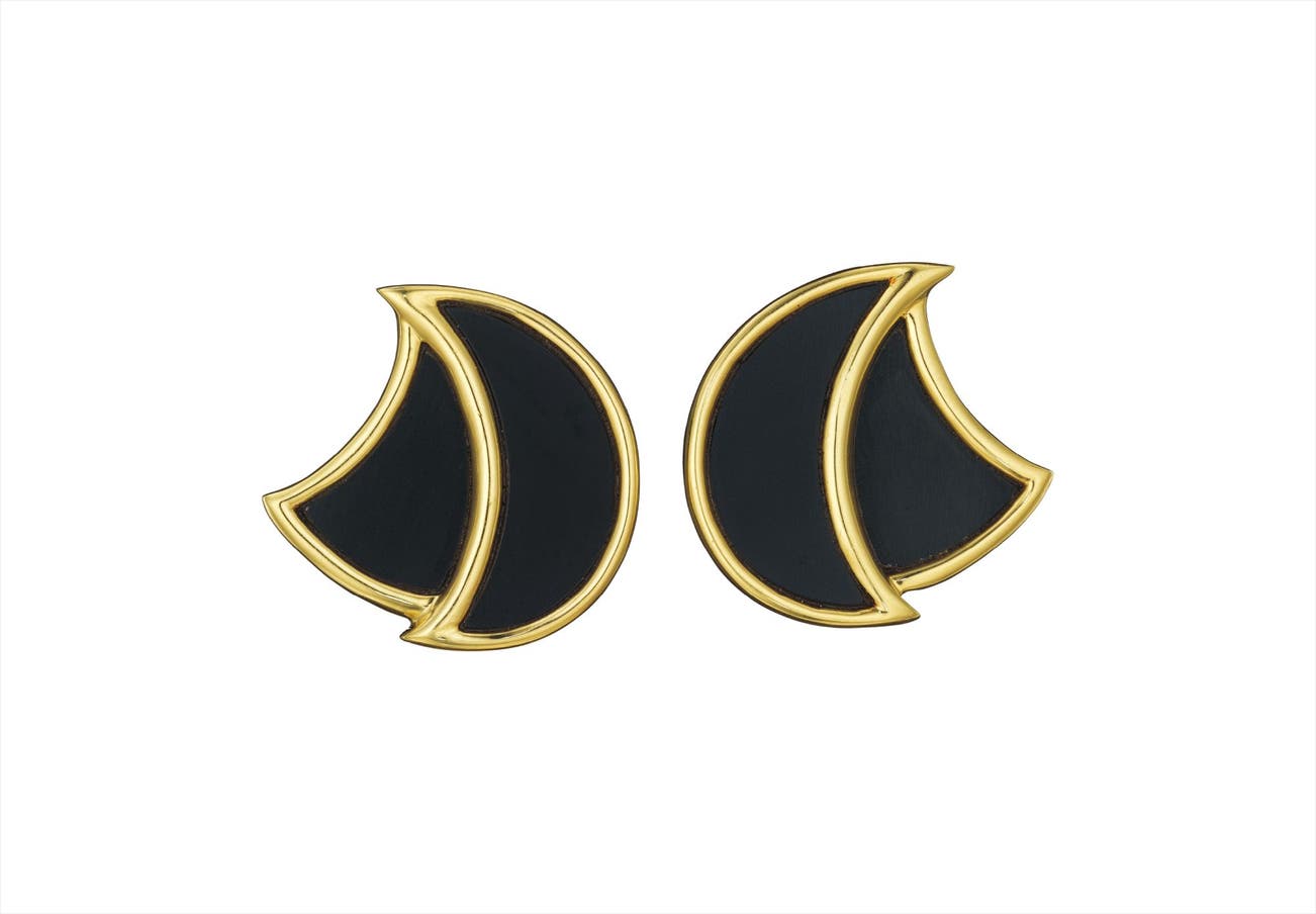 Each designed as a series of overlapping crescent-shaped onyx plaques, enhanced by polished gold borders, mounted in 18K yellow gold, length 1 1/8 inch.