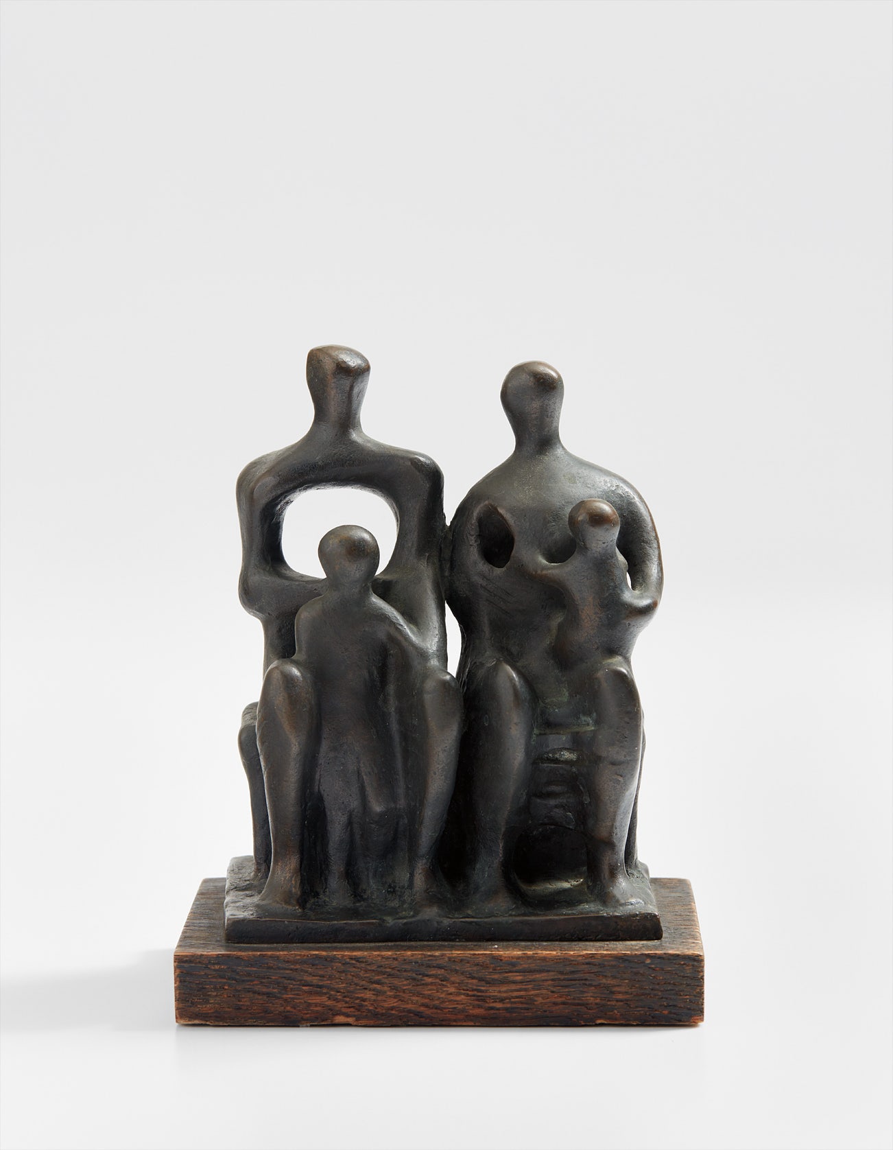 An intimate scene amongst a family unit, Family Group from 1945 encapsulates one of the most celebrated subjects in Moore’s artistic practice, which remains an enduring and universal motif of warmth and affection. The idea of the Family Group first came to Moore in the mid-1930s when invited to complete a large-scale sculpture for the new Village College in Impington, which was designed by Walter Gropius and Maxwell Fry. With the goal of creating a work that would resonate with both children and adults for the school commission in mind, Moore produced many preparatory drawings of families in different arrangements, a number of which were also modeled in clay and later cast in bronze. In the present work, a mother and father sit beside one another on a bench, each affectionately holding a small, loosely defined child. Executed in 1945, Family Group also dates to the period in which Moore was creating his celebrated Shelter Drawings that captured the tenacious spirit of Londoners during the Blitz and led to his appointment as the official war artist by Kenneth Clark. Encapsulating the tender resolve of families who clung together through the darkness of wartime, these drawings were certainly pivotal in his sculptural realization of the family unit.