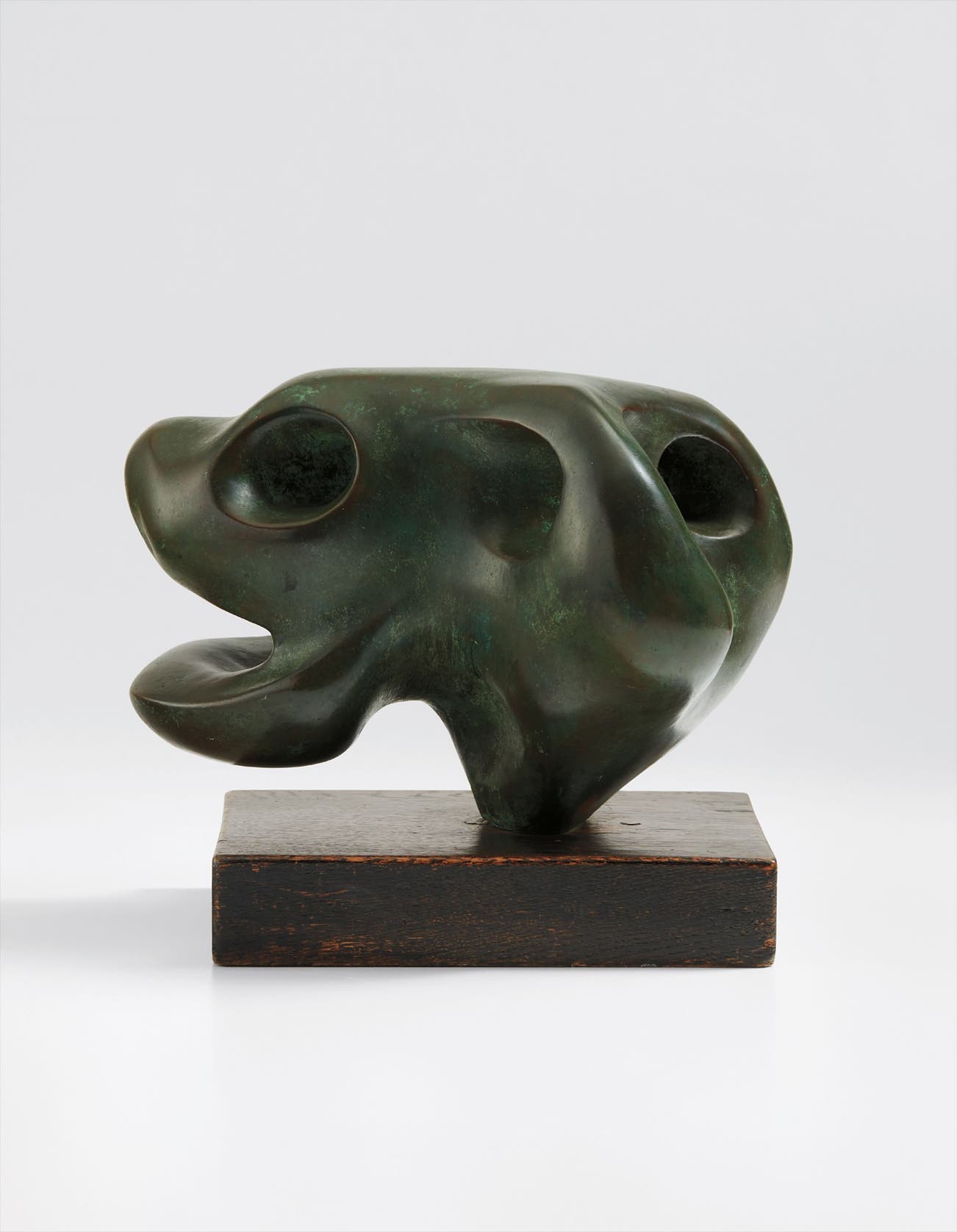 bronze with green patina, on wood base