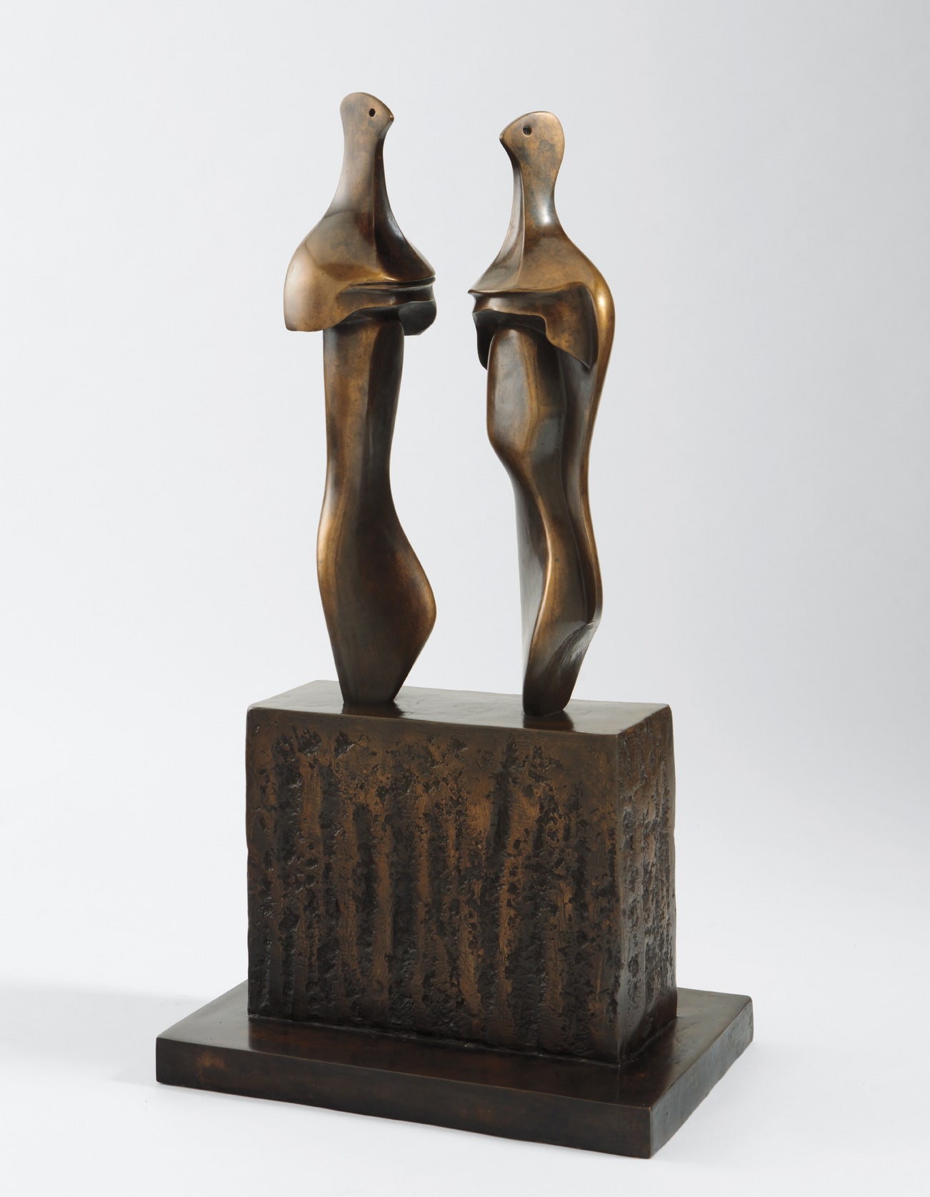 Executed in 1984, Two Three-Quarter Figures on Base displays Moore’s formal rendering of two forms, both elongated and balanced through the artist’s adroit attention to his three-dimensional composition. Perched on a textured base, cast from Moore’s rare experimentations with cork, the curvilinear edges of the figures’ bodies form sloping shoulders, delicate waists and swan-like necks. The figures’ heads are vigilantly perched, crafted with beak-like noses to convey a sense of alert awareness and tenderness. Their protruding busts and delicately arched backs instil a sense of movement, as if the figures may stretch and turn through the lithe nature of their limber bodies. Positioned at an angle, facing inwards, the figures gazes cross past each other into the distance, however both figures appear intrinsically linked through their posture and shared tranquillity. Through Moore’s expert mastery of bronze and acutely ordered composition, the figures’ stasis seems to fluctuate as we move around the sculpture, bringing a sense of movement and narrative to the two forms.