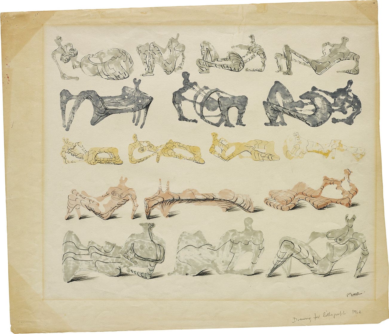 signed, inscribed and dated 'Moore. Drawing for lithograph. 1962' lower right; further sketch crossed through on the reverse