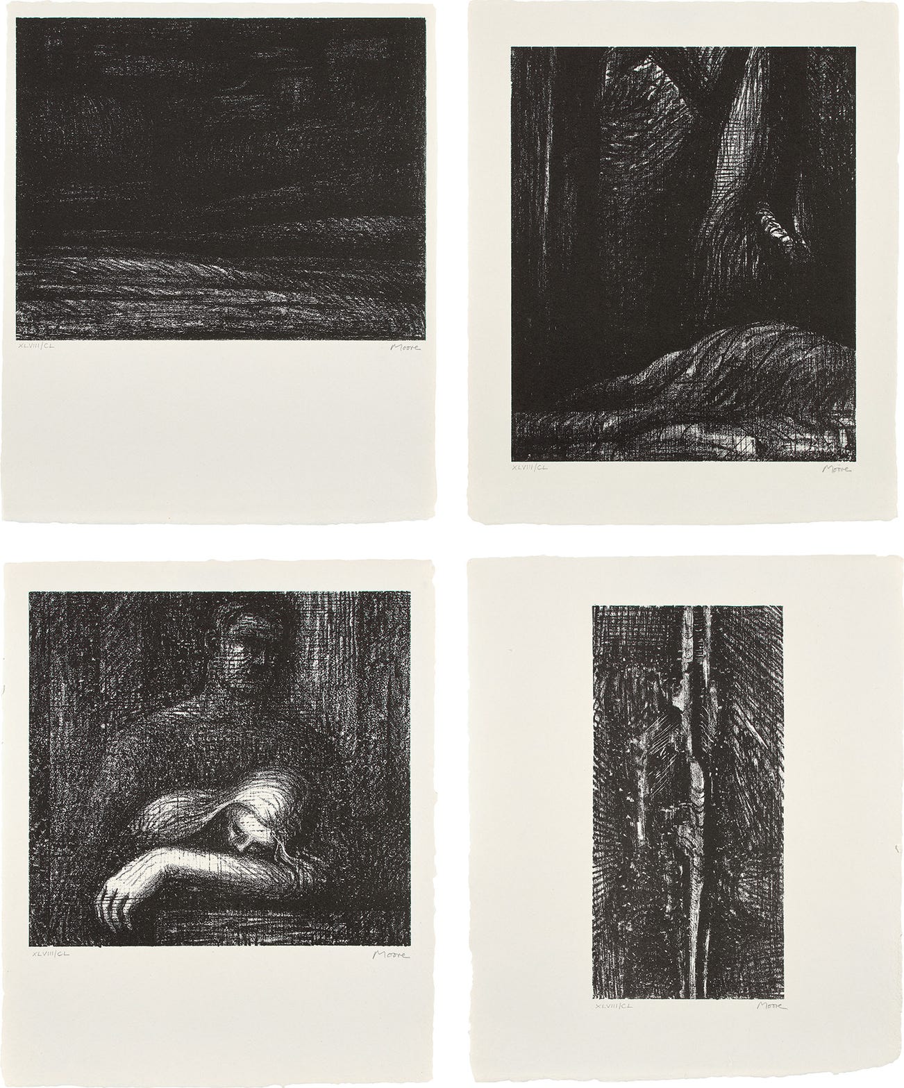 The four loose prints signed and numbered 'XLVIII/CL' in pencil, the book signed and numbered on the justification (there was also an edition of 150 in Roman numerals bound in green linen, there were also 10 artist's proofs), published by Petersburg Press, London, the binding of the book is loose, the inside cover print with minor separation, the portfolio with occasional minor scuffing, otherwise in generally very good condition.