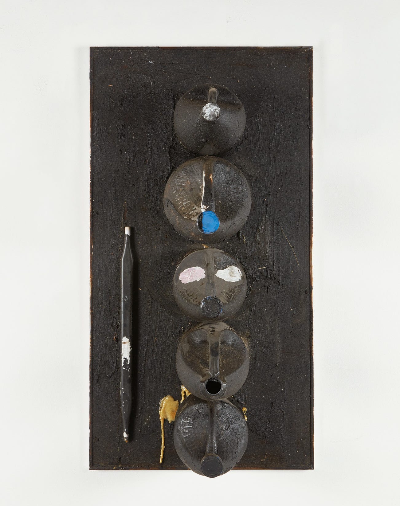 wood, acrylic, spray paint and plastic bottles on wood panel