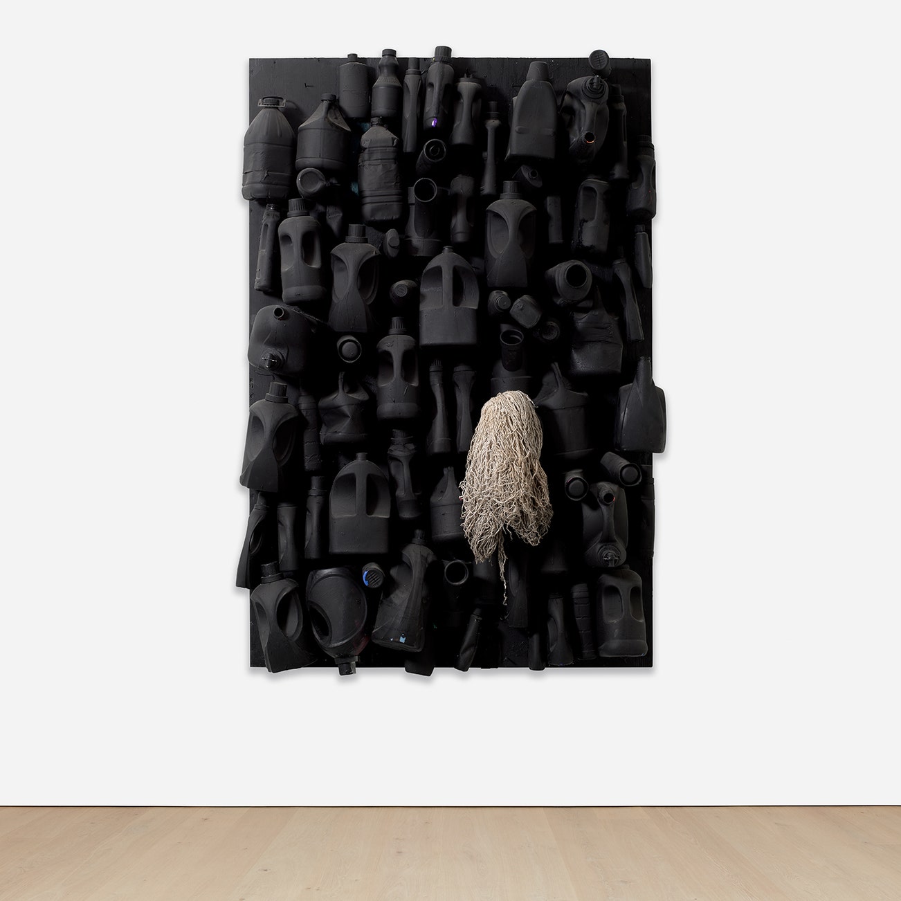plastic bottles, spray paint, acrylic, mop head and nails on panel
