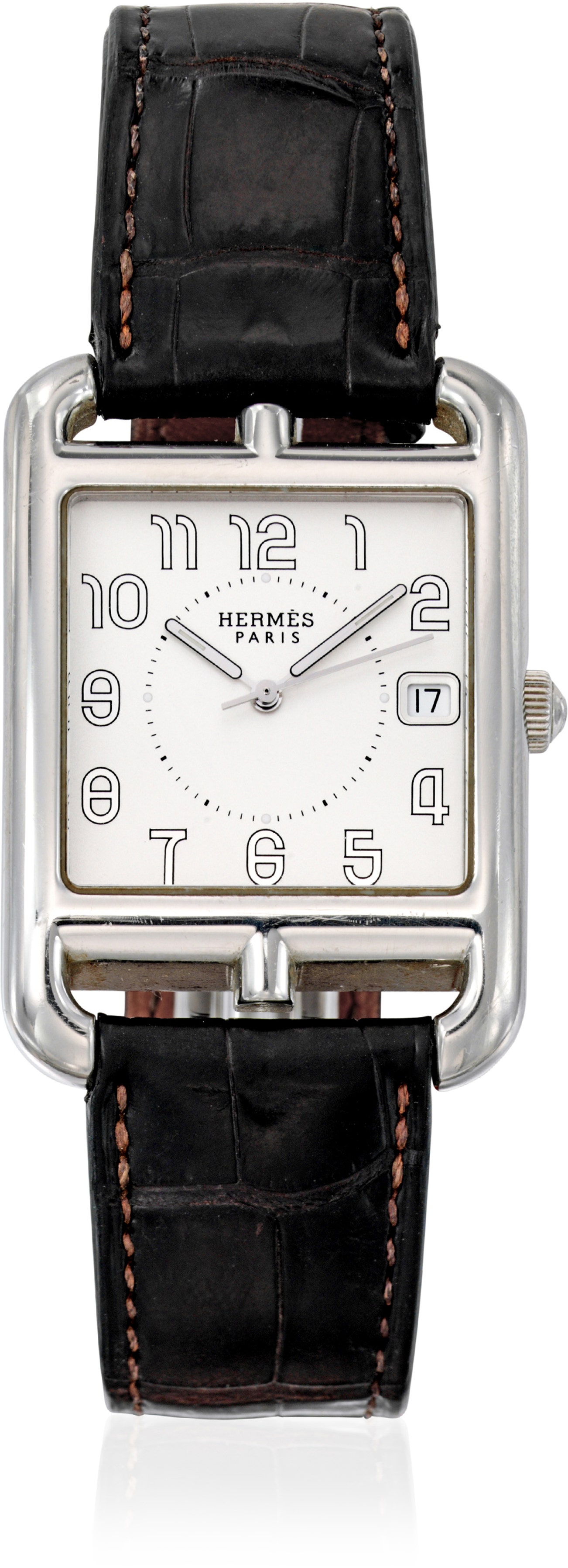 The anchor link-style bezel accented by a crocodile band, mounted in stainless steel, inner circumference approximately 6 3/4 to 7 3/4 inches adjustable, Dial signed Hermès, numbered, accompanied by a signed box.