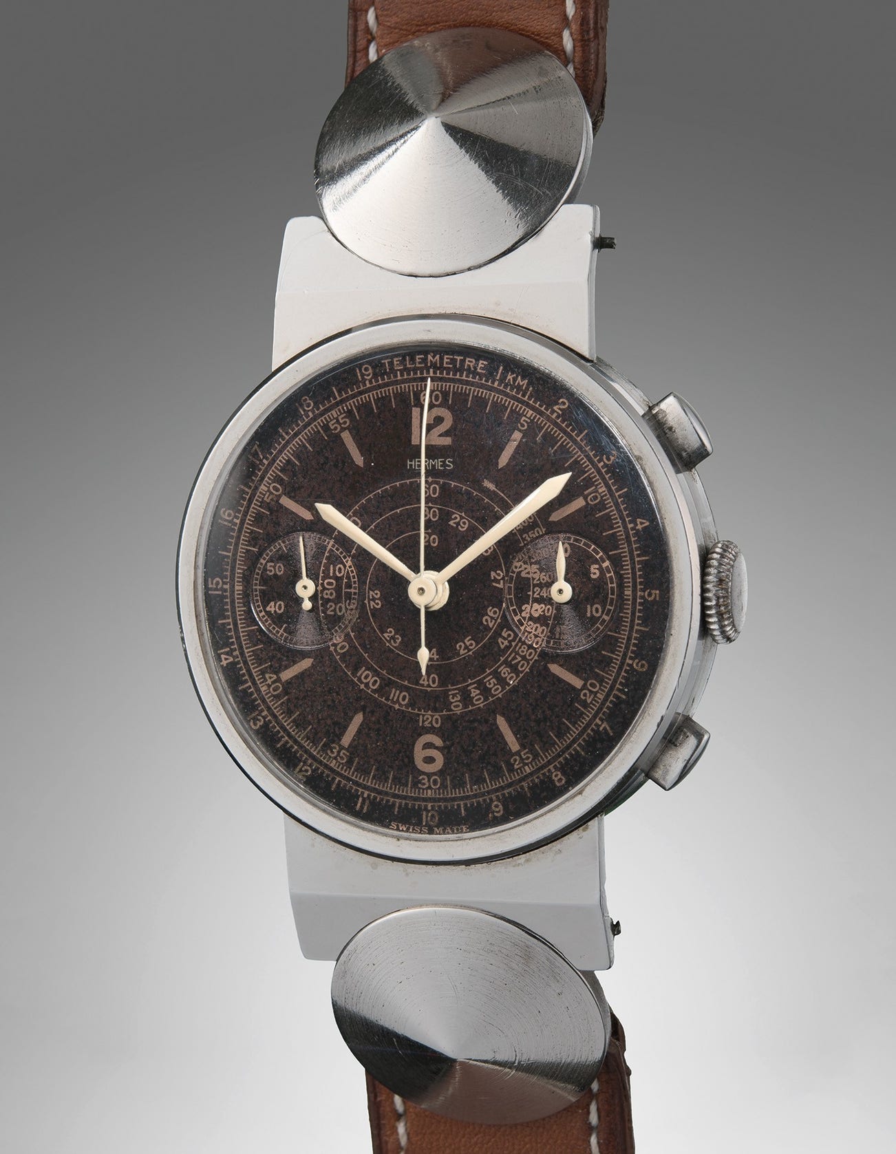 Hermès is an international brand revered for its quality craftsmanship and attention to detail, a commitment they have maintained since their founding in 1837, when Thierry Hermès opened his first harness shop in Paris serving European nobles. Over the decades, the firm branched out adding accessories and clothing, and today it is a multi-billion dollar corporation focusing on highest quality leather goods, fashion, and luxury products. The present chronograph wristwatch from the 1930s is an exemplary example of the firm’s long-term commitment to selling only the highest quality items.