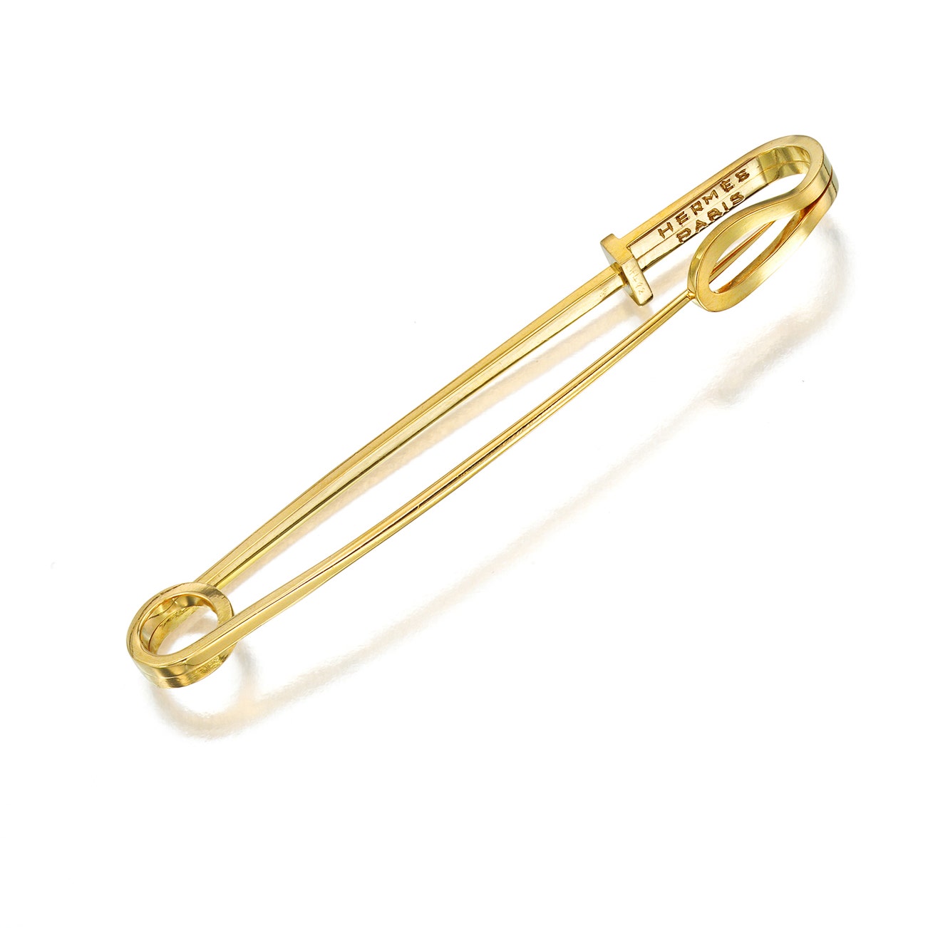 Modeled as a safety pin, mounted in 18k yellow gold, signed Hermès, with French assay mark for 18k gold and maker's mark.