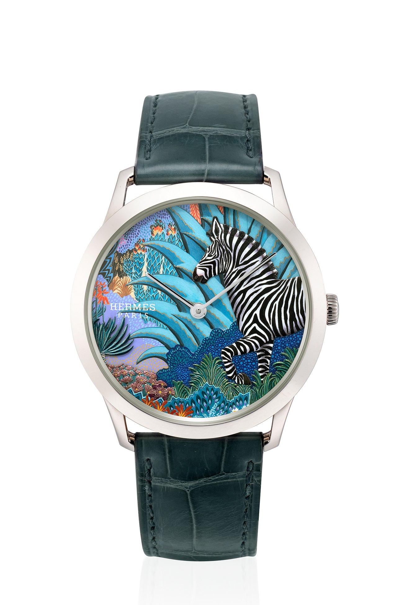 The intricacies of the exotic beasts and the flora of South Africa on this Slim d’Hermès are rendered with miniscule brushstrokes and subtle nuances painted directly onto the mother-of-pearl disk before being fired in a kiln to conserve its brilliant colours. Depicted here is the Cape mountain zebra, which is a rare protected species found in the south-eastern provinces of South Africa. This design by Alice Shirley is modelled on a zebra that has wandered off to explore the fynbos, which is transformed in spring into a fragrant, multi-coloured carpet of flowers, a dreamlike vista. Hermès equipped this limited-edition timepiece with its H1950 movement, which was an automatic movement that was first introduced in 2015. The movement is exceptionally slim, which allows for an elegant slender case.