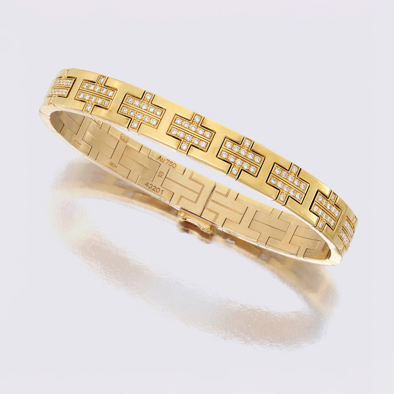 Set with brilliant-cut diamonds, mounted in 18K yellow gold, length approximately 6 1/4 inches, signed Hermes, numbered, with Swiss hallmark, international gold hallmark, and maker's mark.